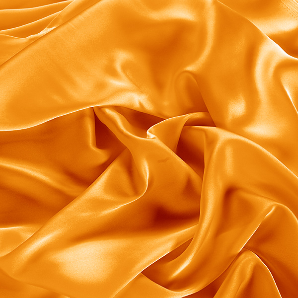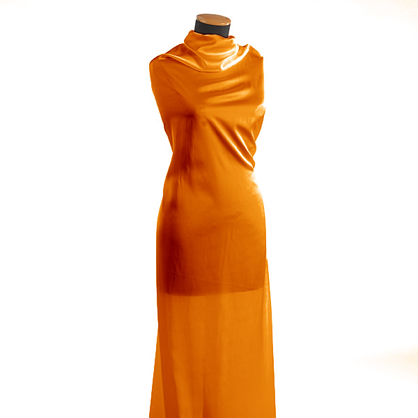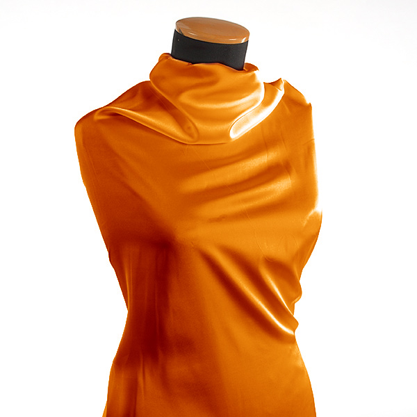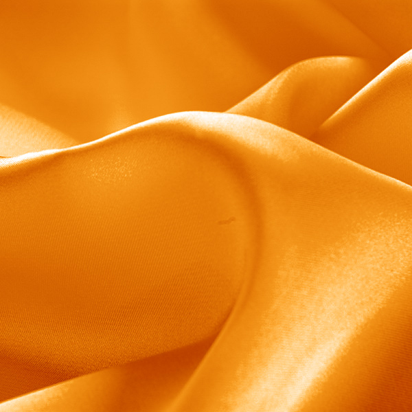 Pružný hladký satén - látka s jemným hladkým povrchem jasně oranžovožluté barvy. Látka má charakteristický saténový lesk, je pružná, splývavá a neprůsvitná.