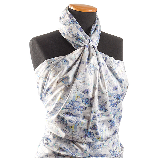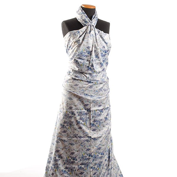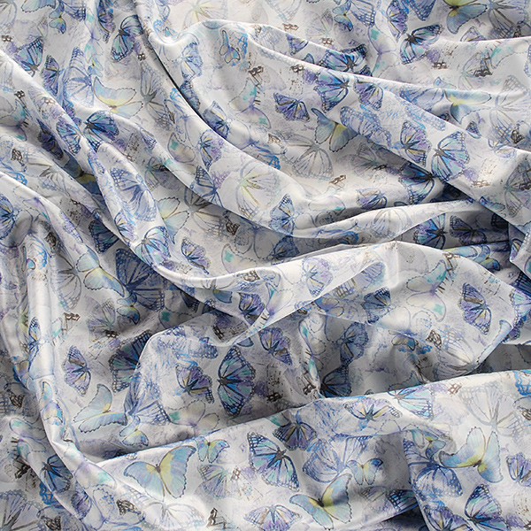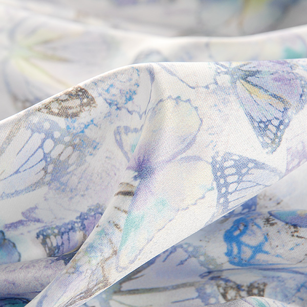 Atlasová lesklá látka s nevšedním romantickým vzorem motýlů v barvách fialové, žluté a sv. fialové. Vzor je digitálně tištěn na jemný pružný satén atlasové vazby, látka je hebká, pružná a splývavá.