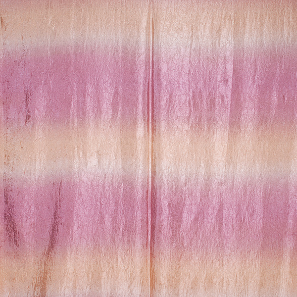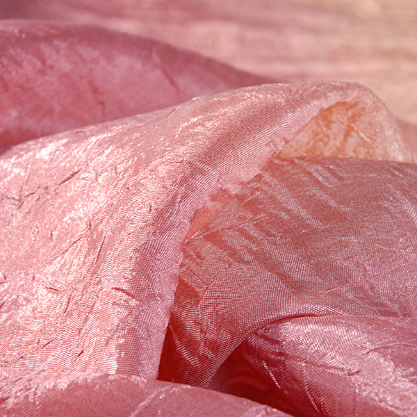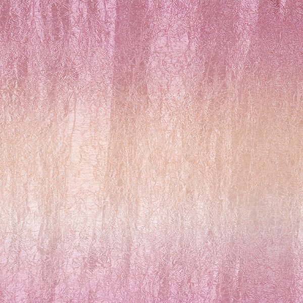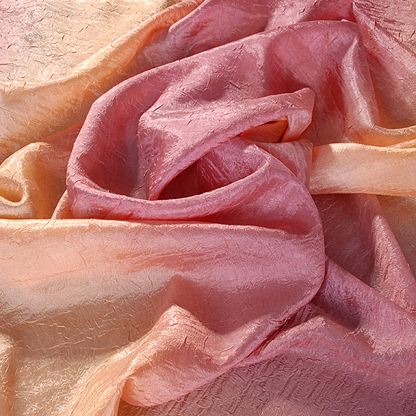 Batikovaná letní látka s úpravou kreš metráž v pasteolových barvách růžové a lososové. Batikovaný vzor je v pruzích vzájemně přecházejících barev. Látka je pdobna organze svým leskem a strukturou, je splývavá a lehce průsvitná.