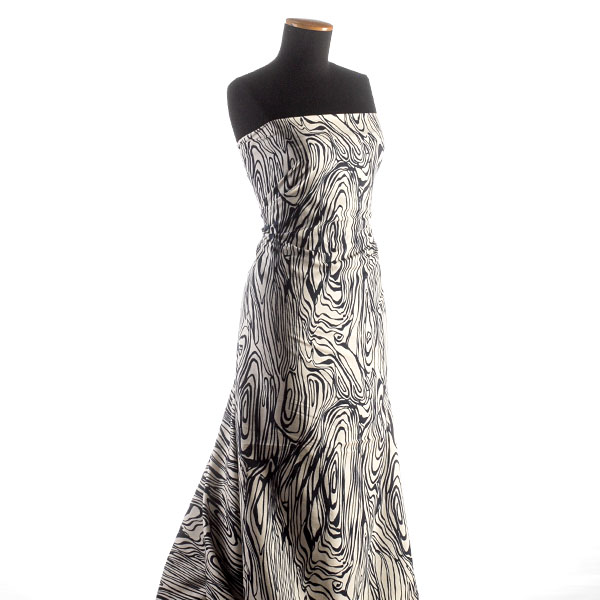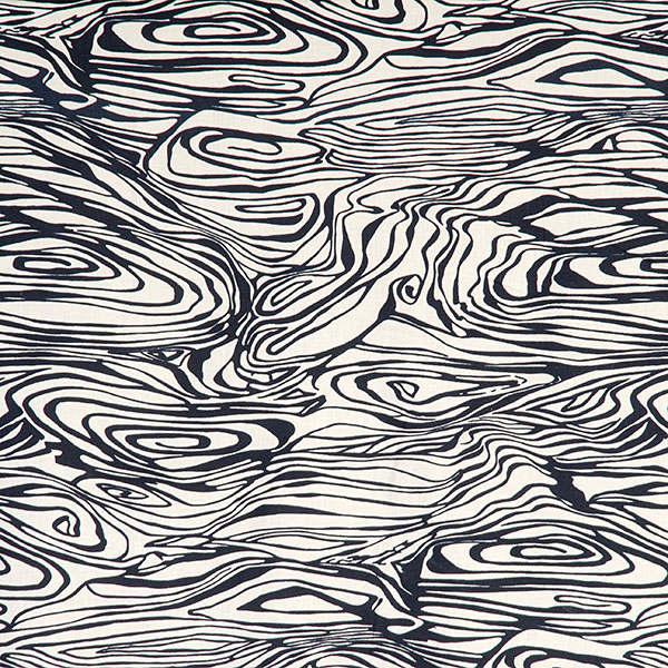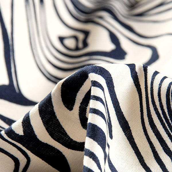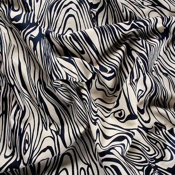Bavlněné plátno tiskpevné s hladkým matným povrchem s modrým abstraktním oválným vzorem na smetanovém podkladě. Bavlněné plátno je lehce splývavá, pevná košilová látka.