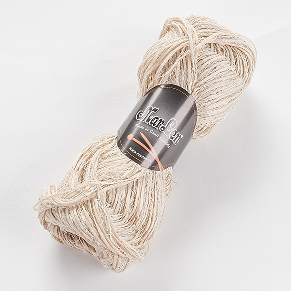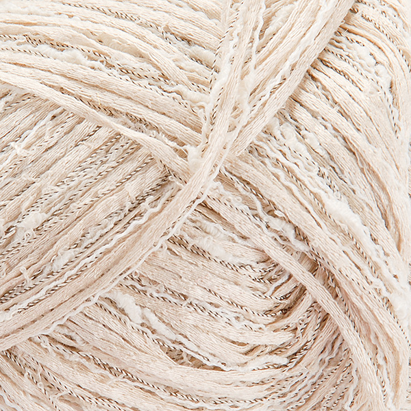 Bavlněná stužková pletací příze - stužková pletací příze doplněna efektní buklé součkovou přízí a drobným nopkem v břízové barvě béžovosmetanového melíru. Bavlněná stužková pletací příze je středně silná, v pletenině bude tvořit nepravidelný melír a jemný plastický vzor.