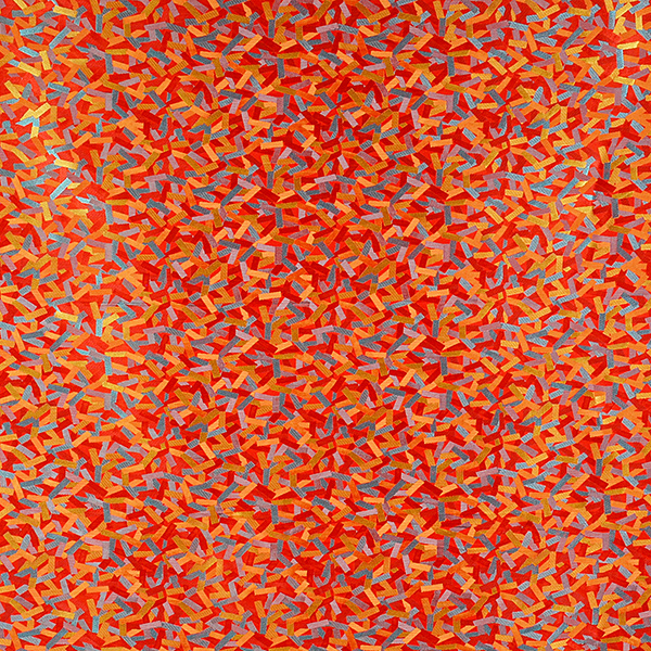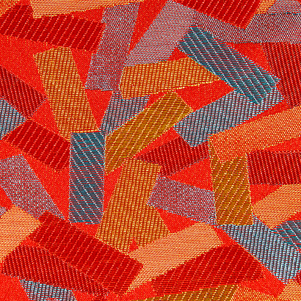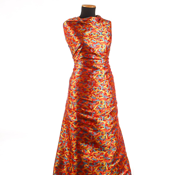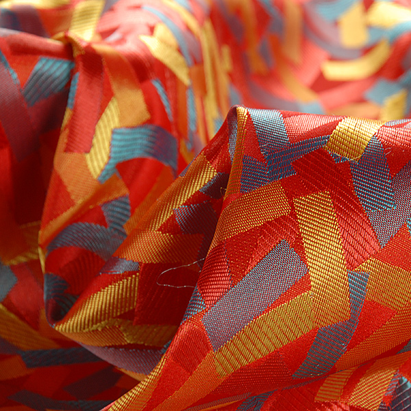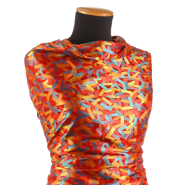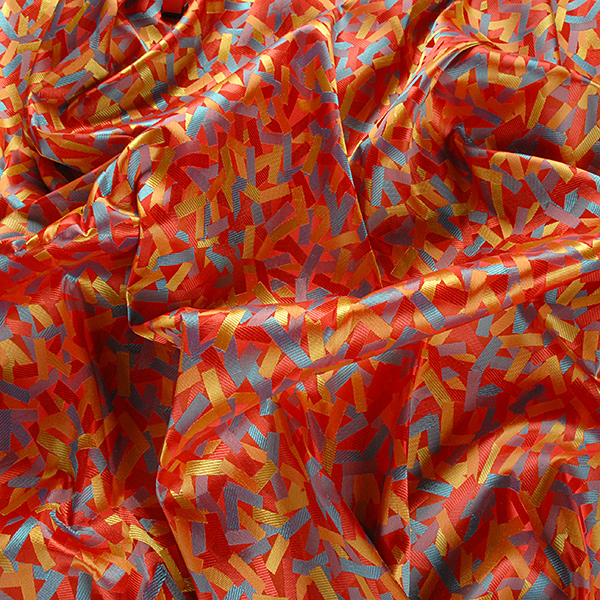 Látkabrokát - žakárový tkaný brokát s geometrickým motivem obdelníků v barvách červené, žluté a tyrkysové na šedém podkladě. Látka brokát je pevnější, má lesklý povrch a bude dobře držet tvar.