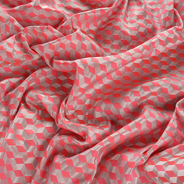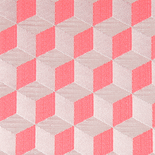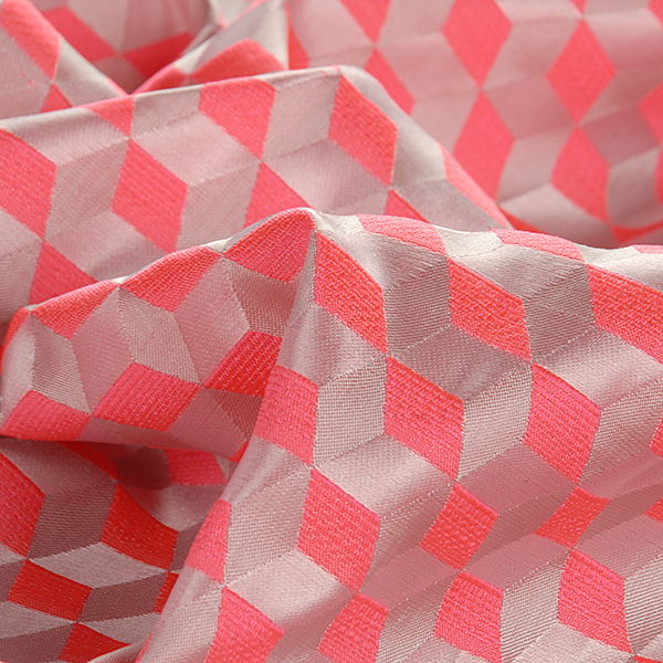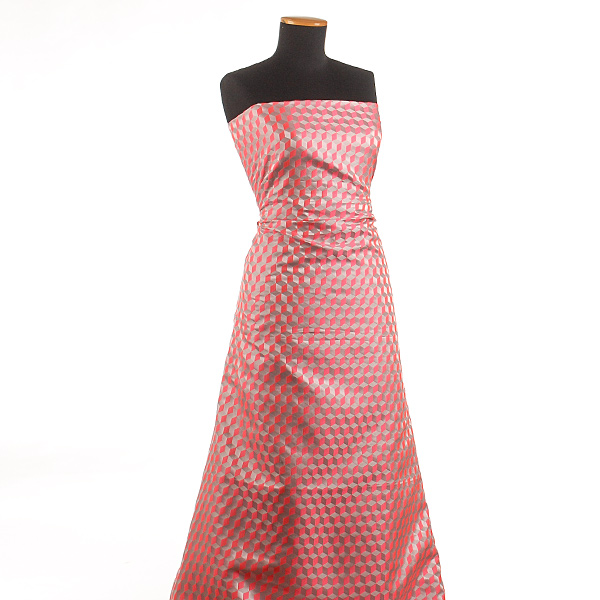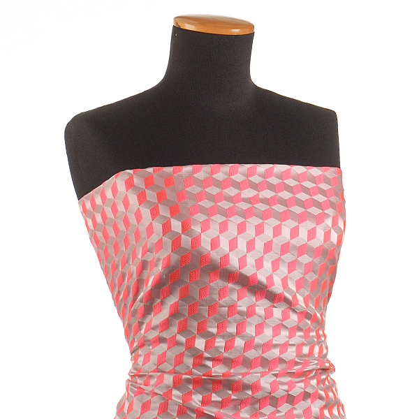 Látkabrokát - žakárový tkaný brokát s geometrickým motivem krychle v barvách šedé a růžové. Látka brokát je pevnější, má lesklý povrch a bude dobře držet tvar.