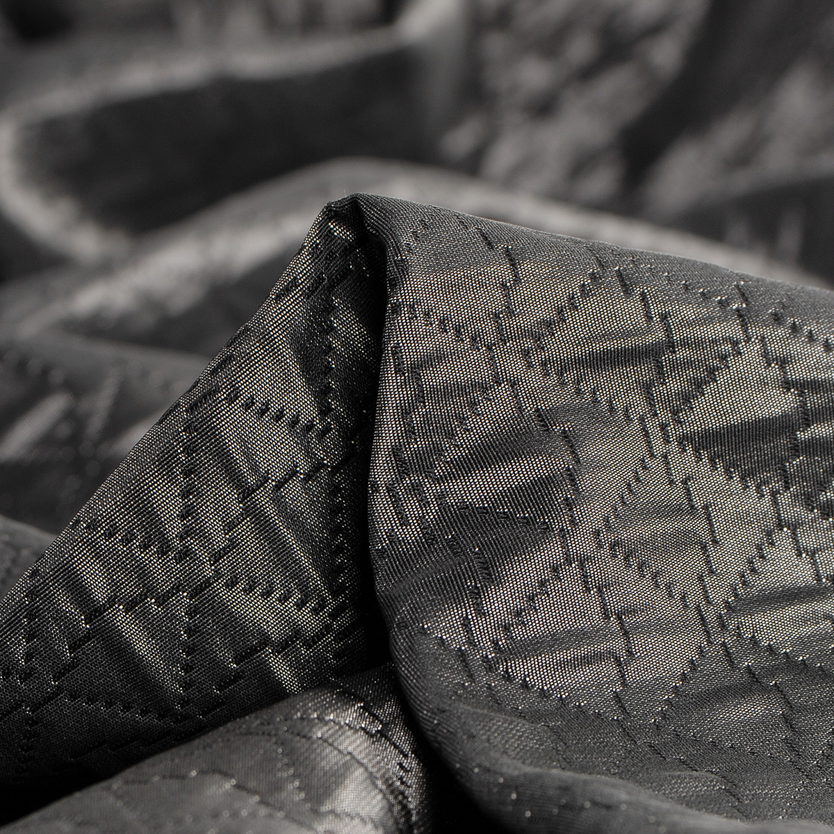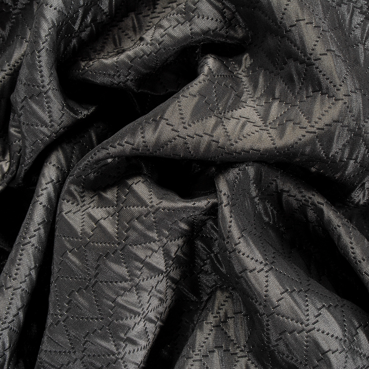 Nepružná brokátová látka s geometrickým lehce plastickým vzorem kosočtverců v černé barvě. Látka je středně silná, má z lícové strany mírně lesklejší povrch, je příjemná na omak a je lehce splývavá - při bohatém řasení bude hezky držet tvar.