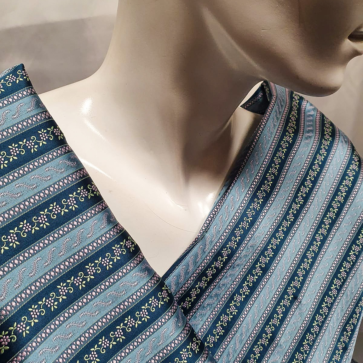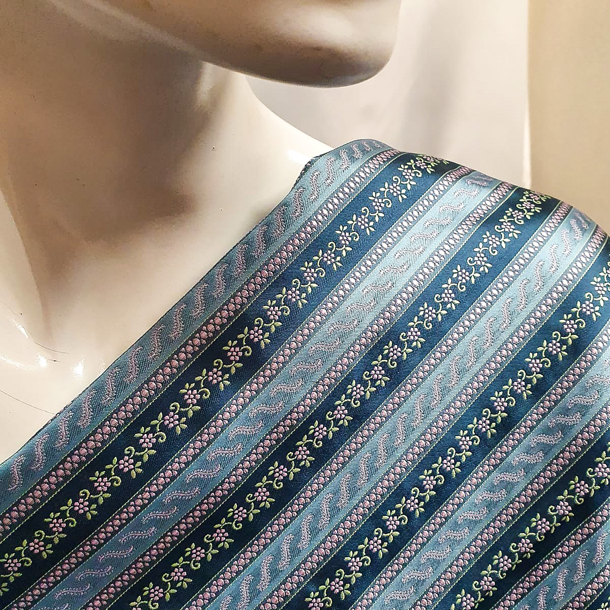 Vzor proužků je uložen po šířce látky, šířka proužků s květem je 16mm, šířka proužku s ornamentem je cca 12mm, velikost květu je cca 5x5mm, celý vzor se opakuje po cca 5cm.