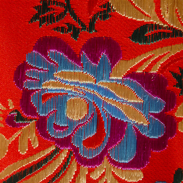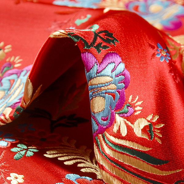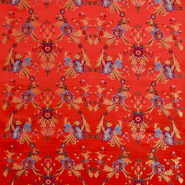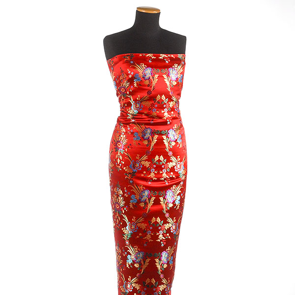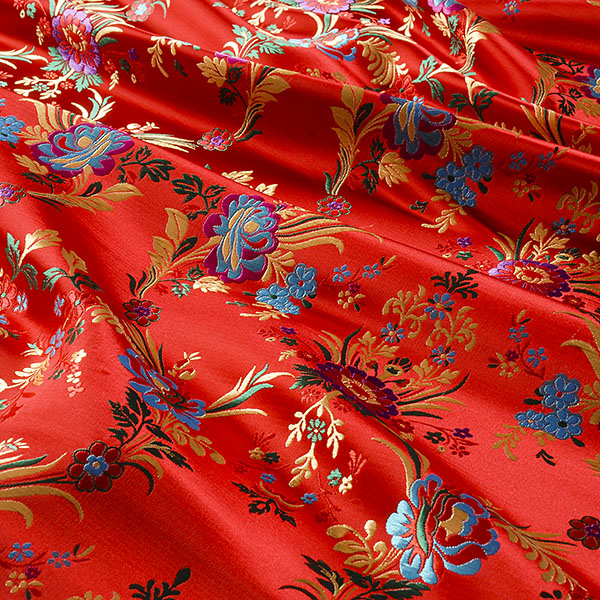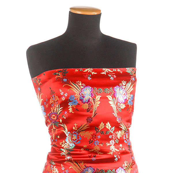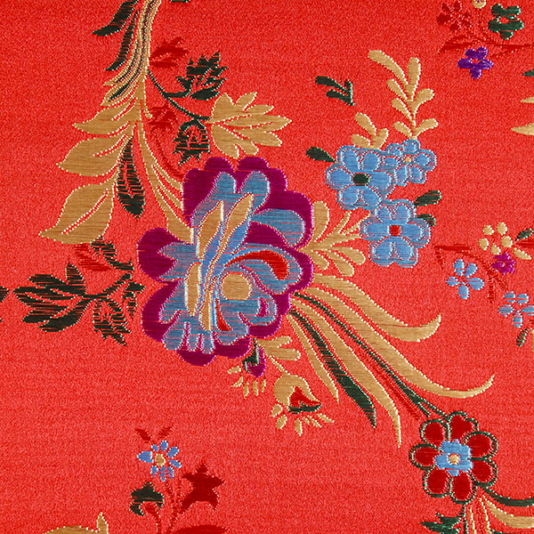 Brokát s folklórním motivem červený- žakárový tkaný brokát s folklórním motivem květin v barvách fialové, modré, žluté, zelené a červené na červeném podkladě. Brokát s folklórním motivem květů červený látka je pevnější, jen lehce splývavá, má lesklý a jednostranný povrch.