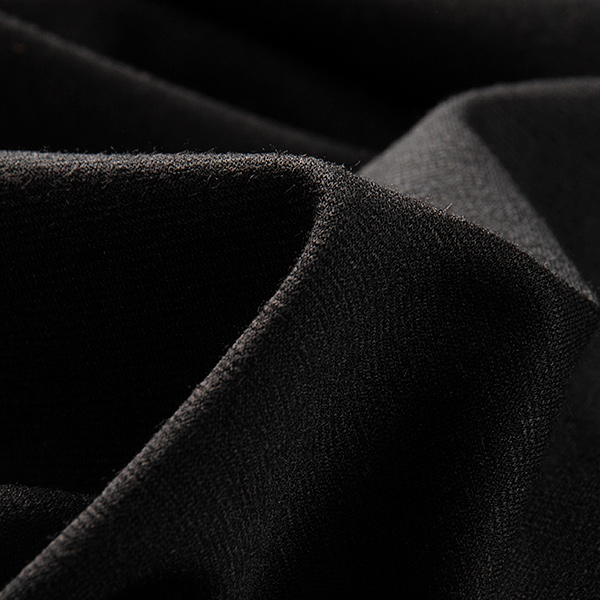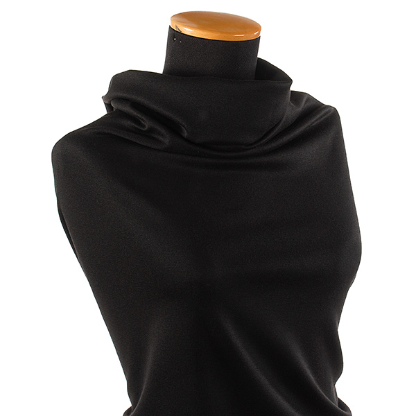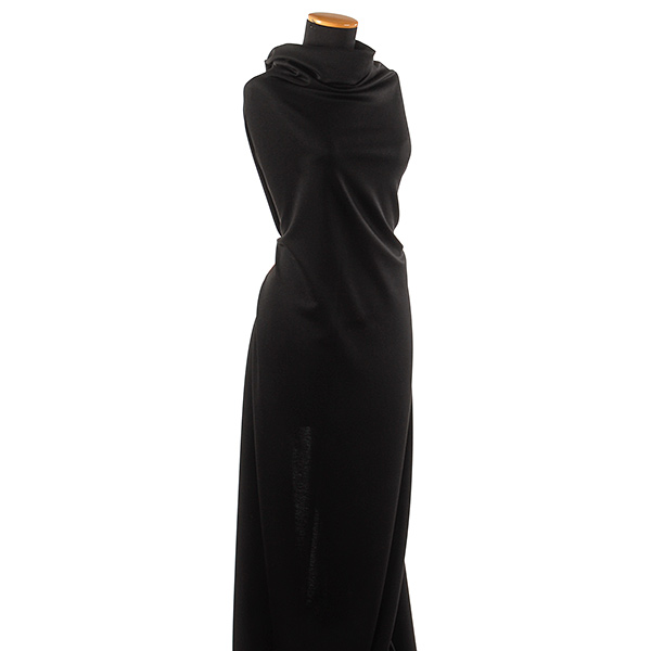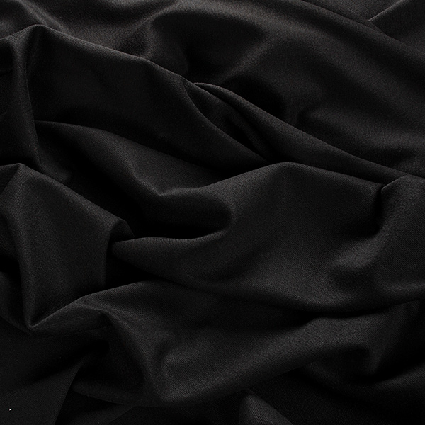 Středně silný úplet pletenina úplet s jemným hladkým matným povrchem černé barvy. Látka je střední síly je pružná a splývavá.
