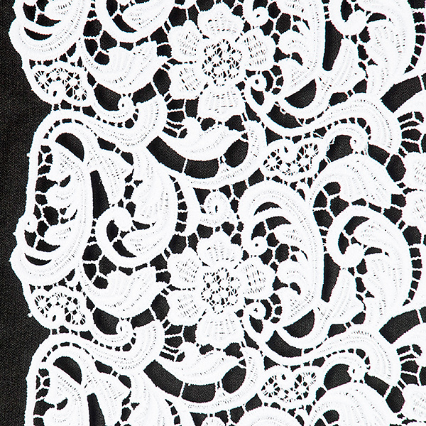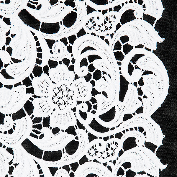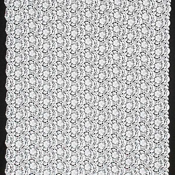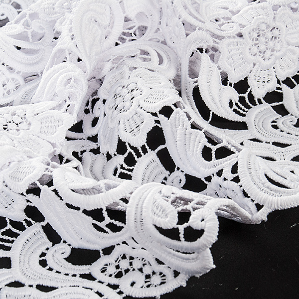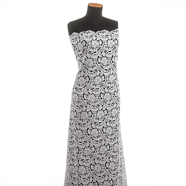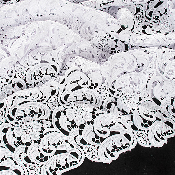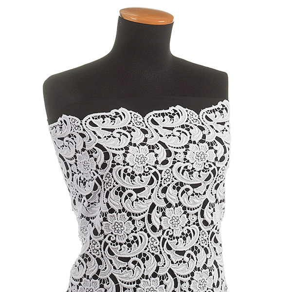 Efektní krajka s hrubým plastickým vzorem - látka s květinovým motivem v bílé barvě. Krajka má každý kraj lehce odlišně zdobný, je průsvitná a splývavá. Je dost pevná a vhodná i na korzet. Vzor se opakuje cca po 10cm, velikost květu je cca 5x5 cm. Krajka má matný povrch je podobna bavlněným krajkám.