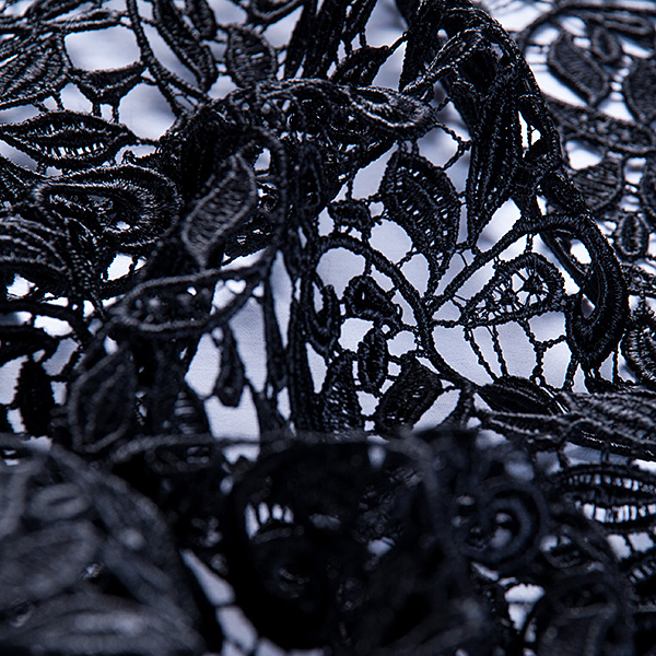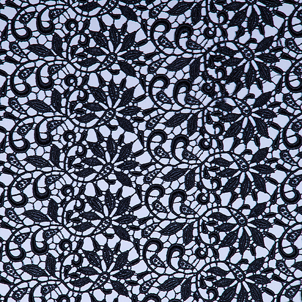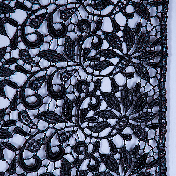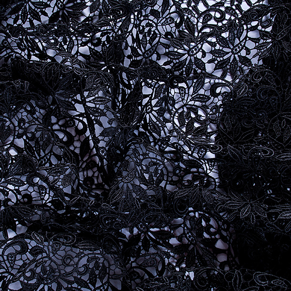 Efektní krajka s hrubým plastickým vzorem - látka s motivem květů v černé barvě. Krajka má oba kraje stejně zdobné, je průsvitná a splývavá. Je dost pevná a vhodná i na korzet.