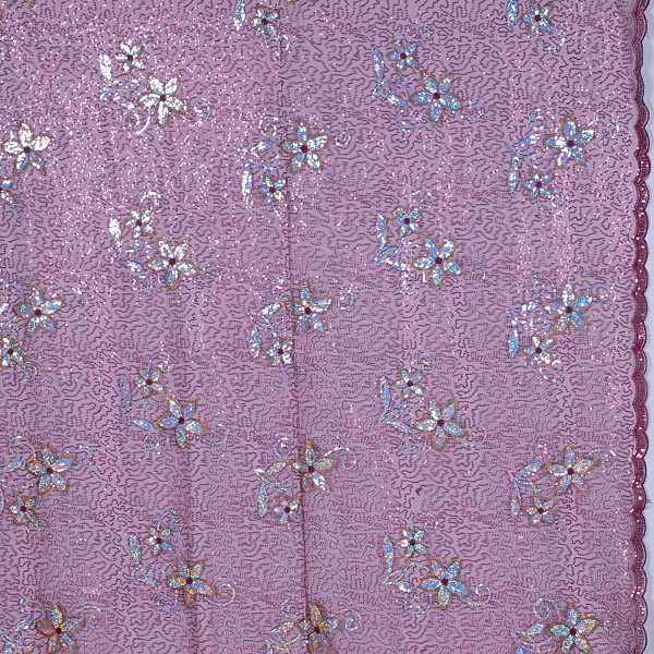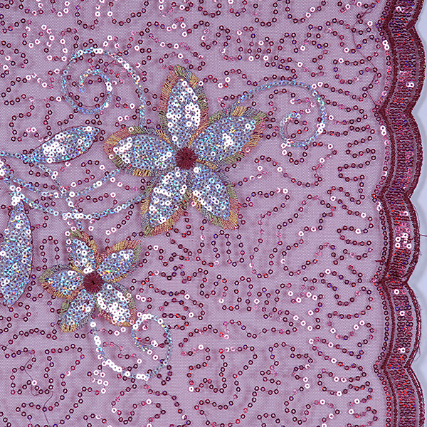 Velikost vzoru: oba kraje jsou zdobeny flitrovou vyšivkou vlnky o velikosti cca 2cml. Velikost květinového vzoru je cca 20 x 20 cm.