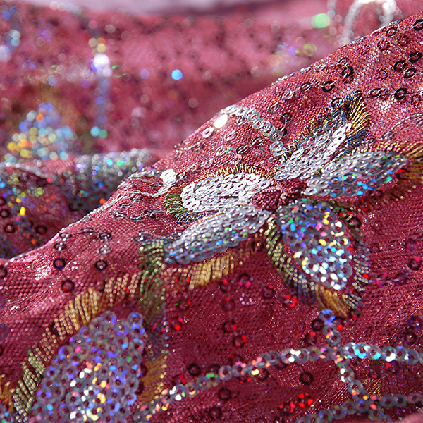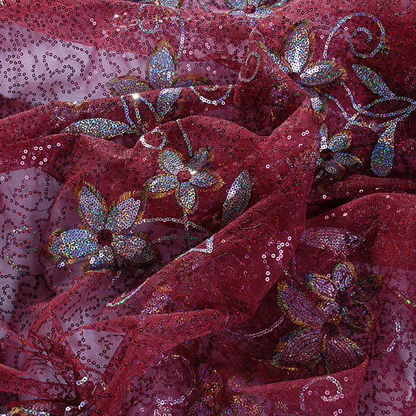 Efektní jemná krajka s flitrovou a lurexovou výšivkou na tylu - látka vyšívaná krajka na tylu s květinovým vzorem s lurexovou výšivkou ve zlaté barvě a flitrovou výšivkou v barvě zlatostříbrné a vínové na vínovém podkladě. Krajka mírně pruží svou vazbou, je průsvitná a splývavá.