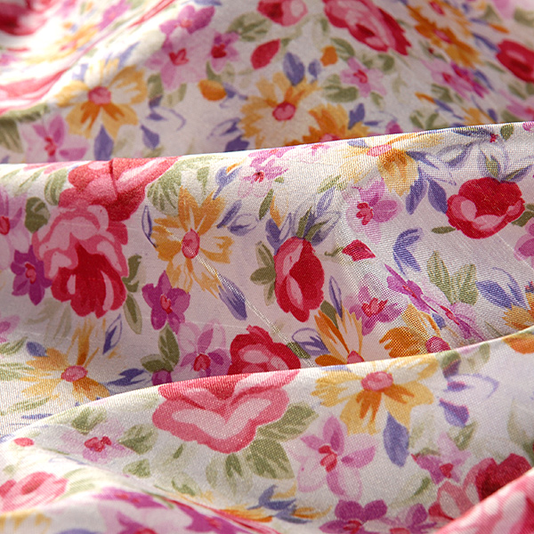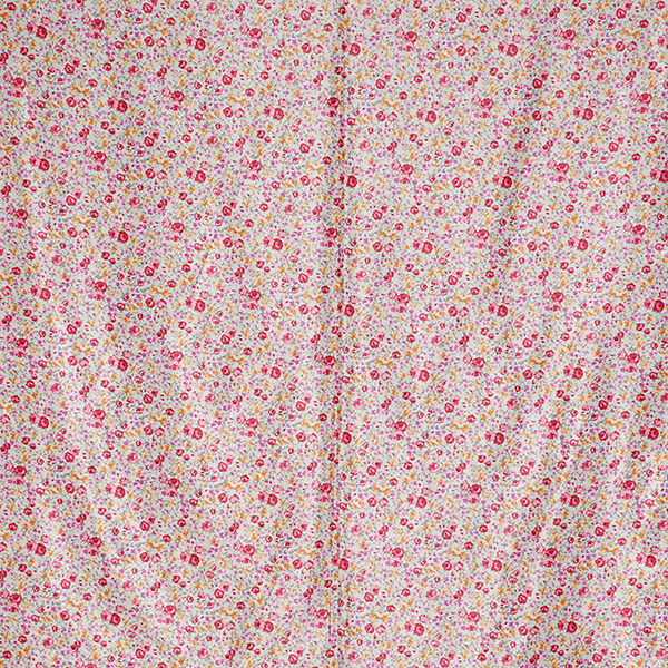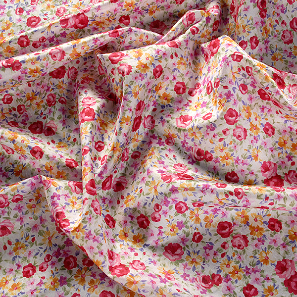 Efetkní látka metráž - imitace hedvábí jemná metráž tisk motiv květů v jasných barvách růžové, starorůžové, žluté a fialkové na podkladě barvy slonové kosti. Látka je podobna šantungovému hedvábí svou strukturou a typickým leskem, je lehce splývavá.