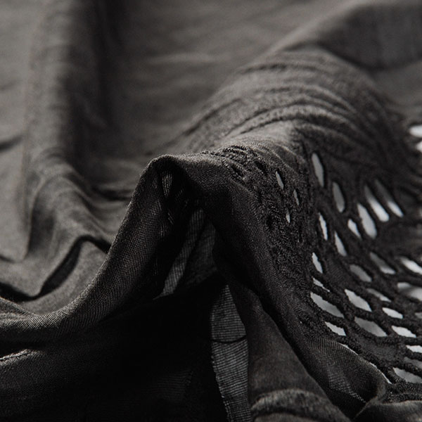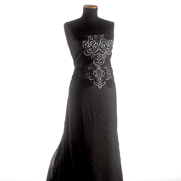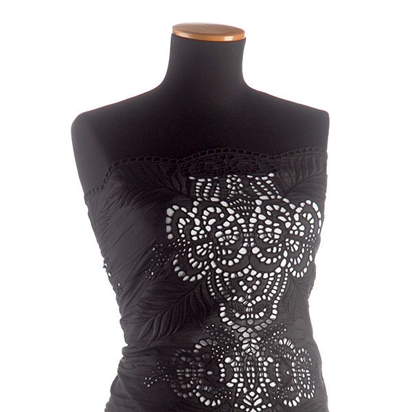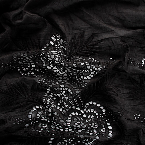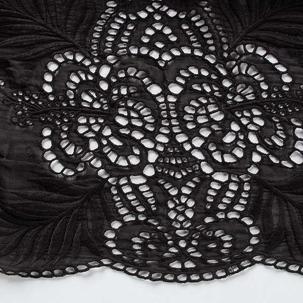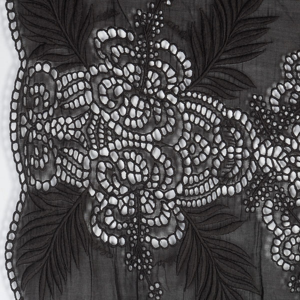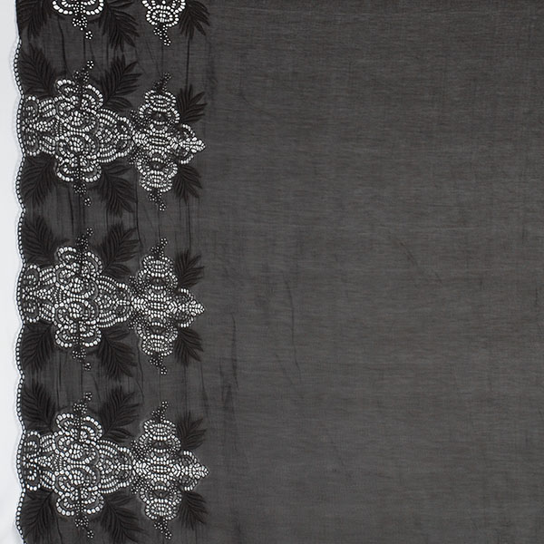Etamín látka s krajkovou bordurou jemná látka směs bavlny s viskozou plátnové vazby s květinovou výšivkou v černé barvě. Etamín látka s krajkovou bordurou je velmi jemná, lehce pružná svou vazbou a splývavá.