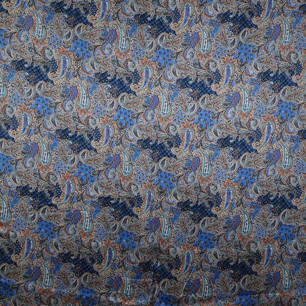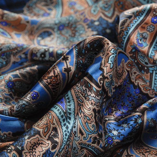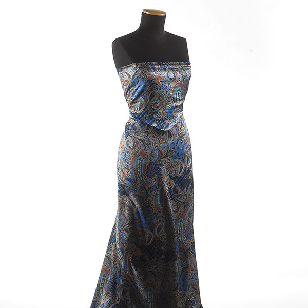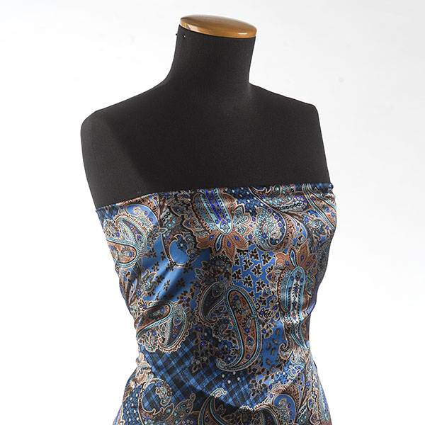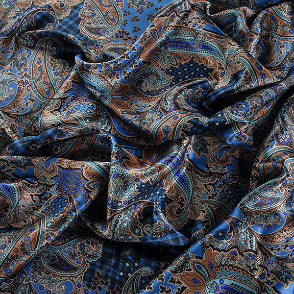 Hedvábný atlas pružný paisley vzor v modrohnědé v barvách světlé i tmavé modré, šedé, černé a tmavě hnědé.Hedvábný atlas pružný paisley vzor v modrohnědémádigitálně tištěný vzor, látka je pružná po délce, je splývavá, má jemný hedbký lesklý povrch a je velmi příjemná na omak.