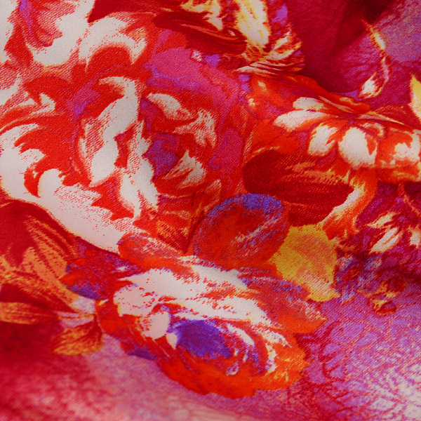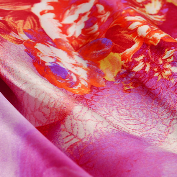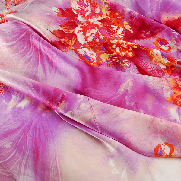 Hedvábný vzorový satén - látka s květinovým vzorem na smetanovém podkladě v pastelových fialkových, fuchsiových, žlutých a oranžových barvách. Je možné jej kombinovat s šifonem ve stejném vzoru. Látka je splývavá, mírně pružná a není průsvitná.