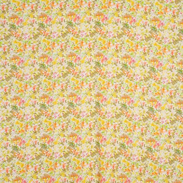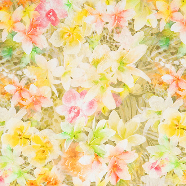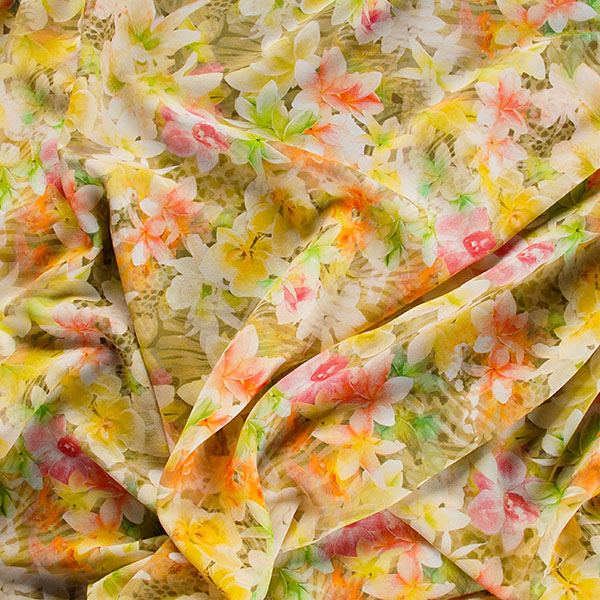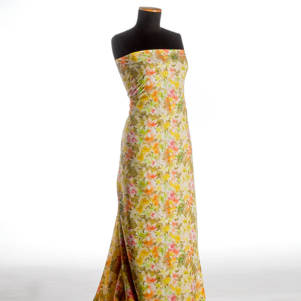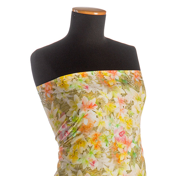 Imitace hedvábí - zelenožlutá látka s květinovým vzorem.Imitace hedvábí látka je bohatě splývavá, jen lehce průsvitná a lehce pružná.
