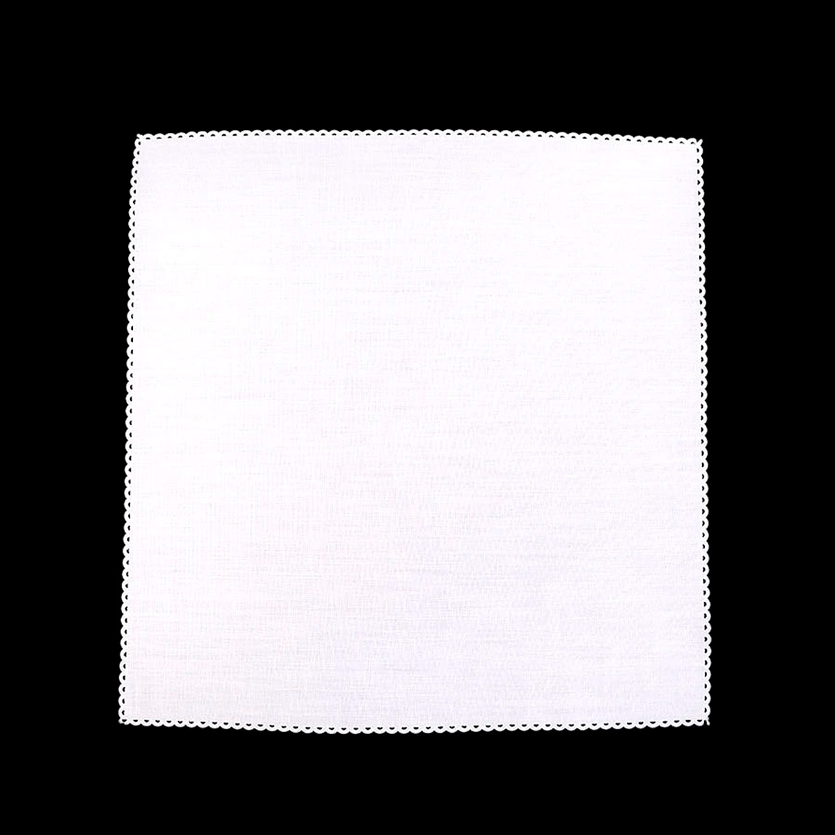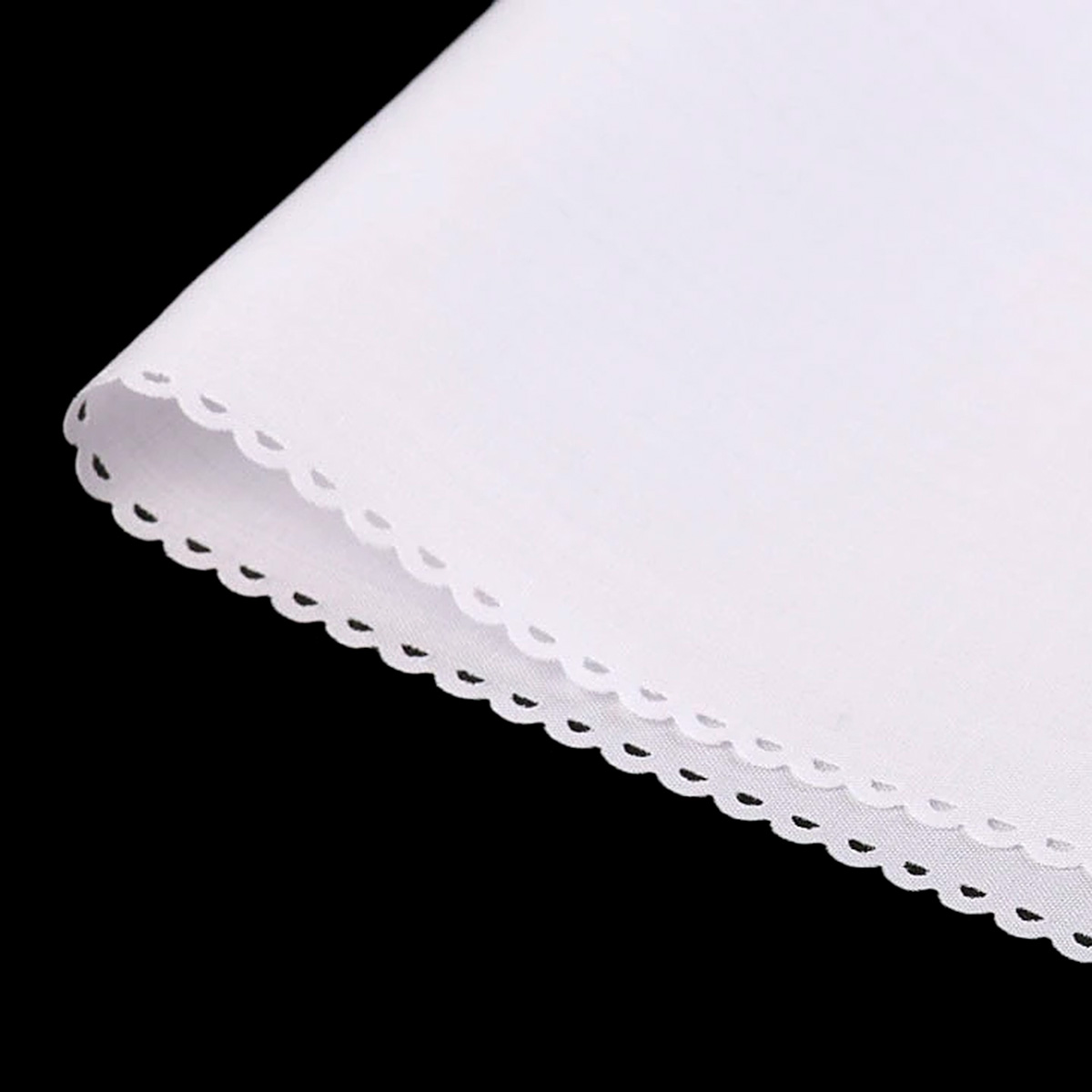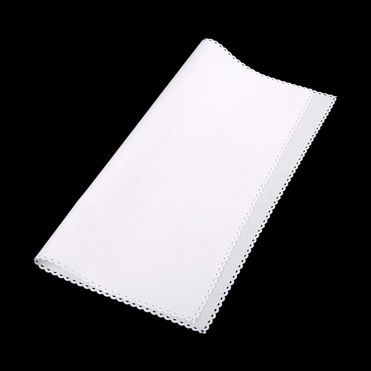 Bavlněný ozdobný kapesník do saka v bílé barvě. Kapesník má matný hladký povrch, všechny okraje mají zdobné zakončení.