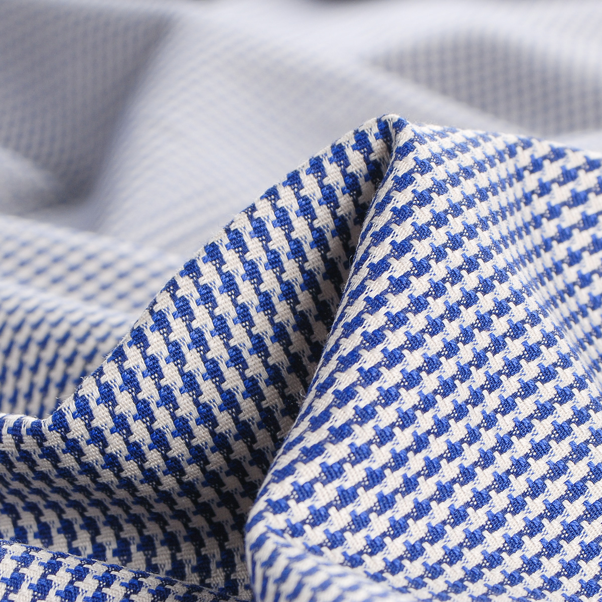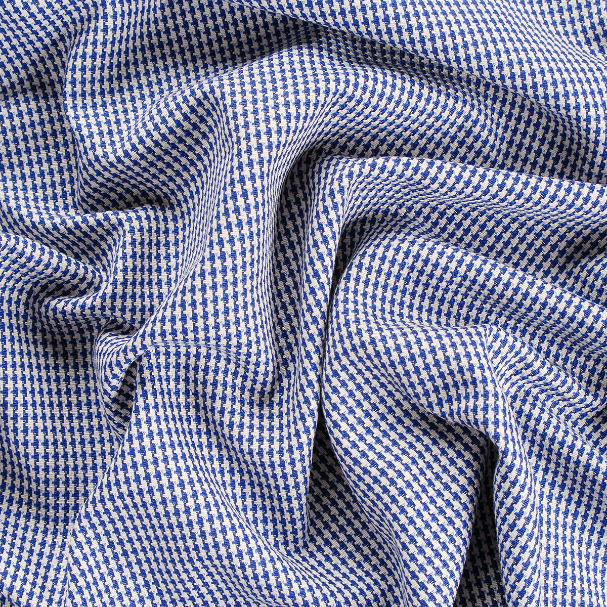 Kostýmová bavlněná látka vzro pepito nebo i kouhotí stopa v barvách tmavší modré a bílé. Látka je středně silná, s matným povrchem, je lehce splývavá a pružná, je vlemi příjemná na omak.