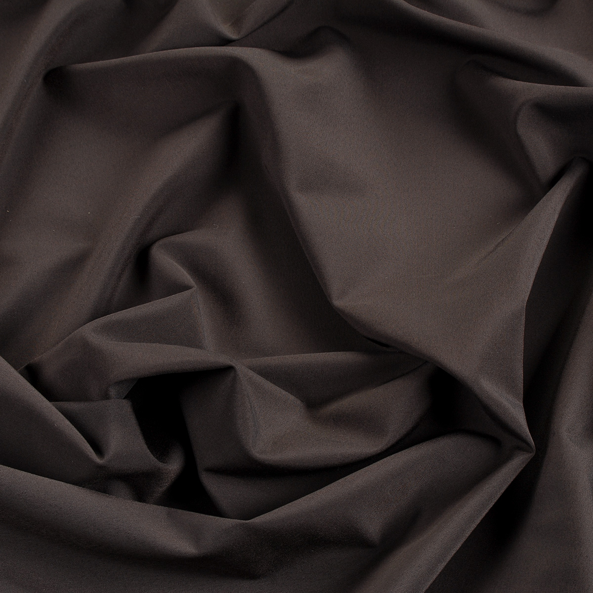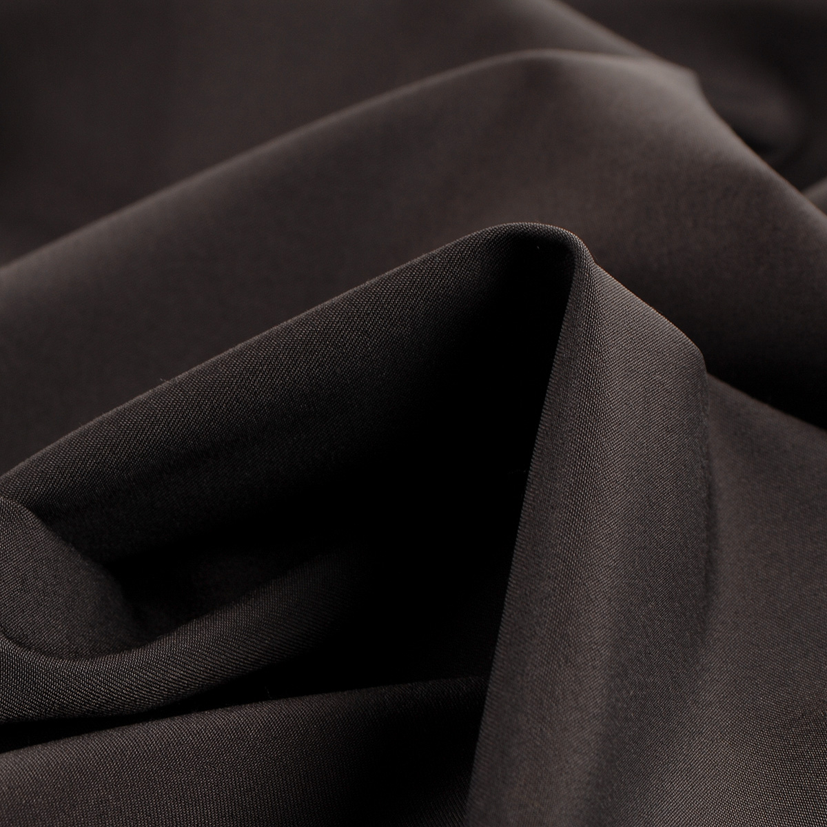 Kostýmová elegantní pružná látka tmavě hnědé barvy s matným povrchem. Látka je lehce splývavá a příjemná na omak, je pružná v obou směrech, téměř se nemačká, hezky drží tvar a není průsvitná.