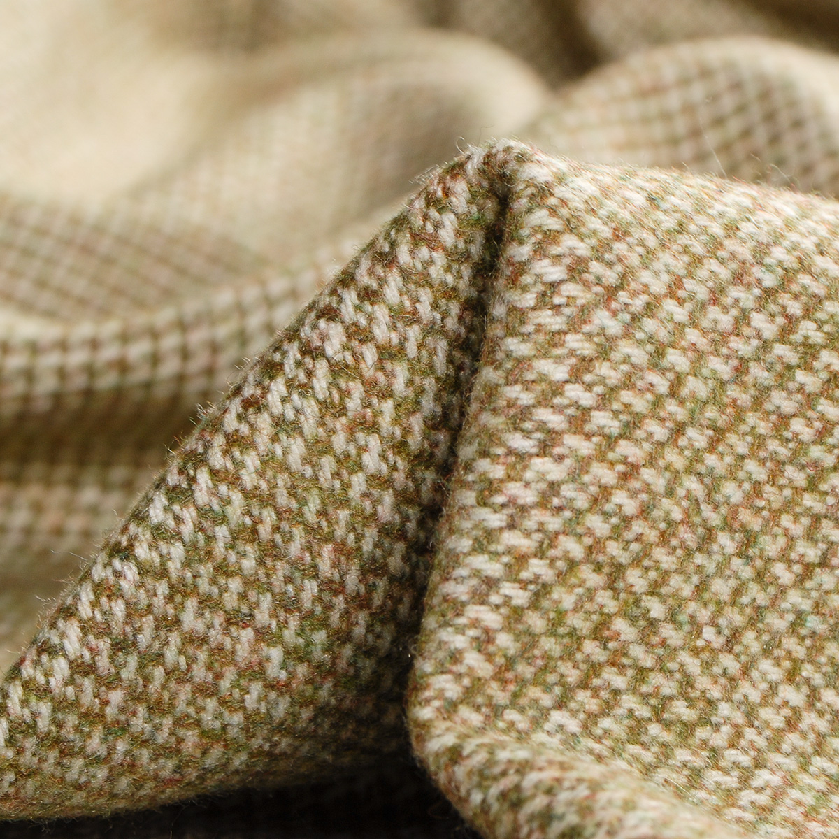 Kostýmová látka podobna ručně tkané metráži s lehce plastickou strukturou zatkaných nití v barávch mechově zelené a smetanové. Tkanina je lehce splývavá, je příjemná na omak, má drobný vlas. Rub i líc jsou rozdílné, lze pro efekt použít oboustranně.