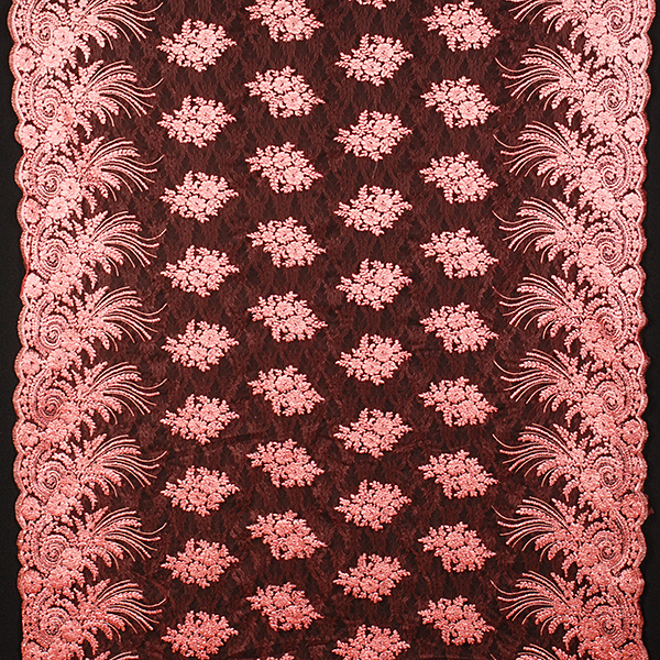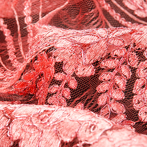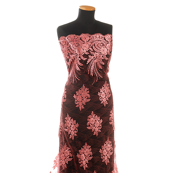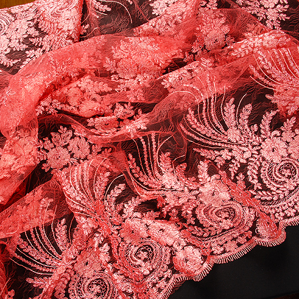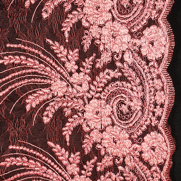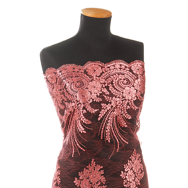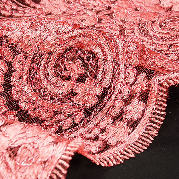 Efektní krajka výšivka na tylu v růžové barvě s květinovým motivem na vzorovém tylu barvy. Podkladový tyl je tmavší růžovo-malinové barvy, výšivka je doplněna růžovým lurexovým vláknem Metráž je pružná svou vazbou, splývavá a průsvitná.