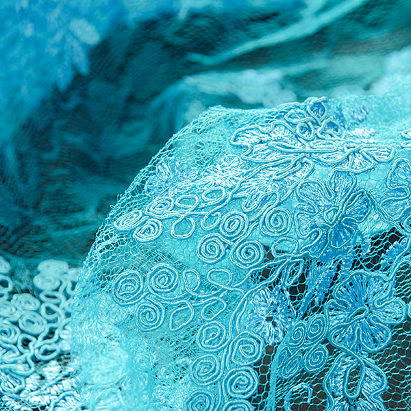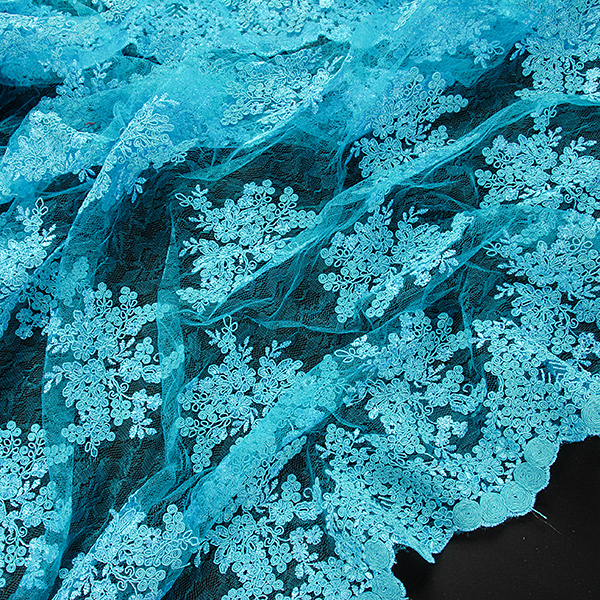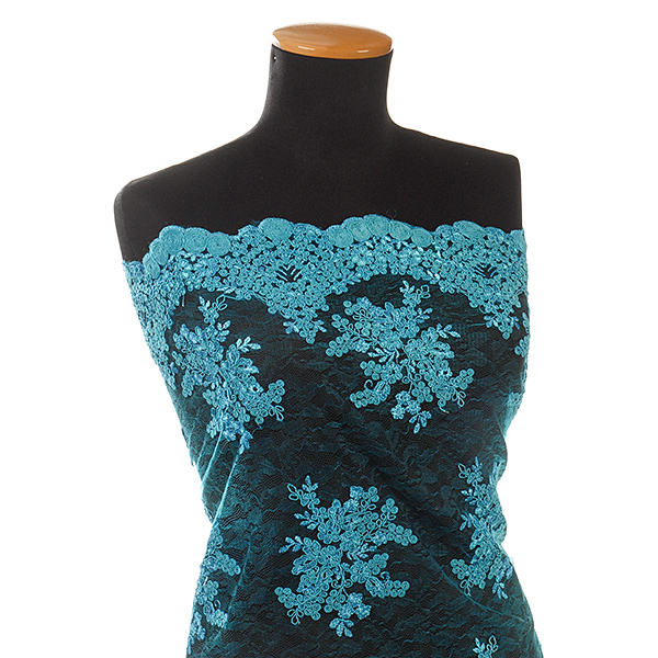 Efektní krajka výšivka na vzorovém tylu v tyrkys modré barvě s květinovým motivem. Podkladový vzorový tyl je barvy slonové kosti s krajkovým motivem. Metráž je pružná svou vazbou, splývavá a průsvitná.