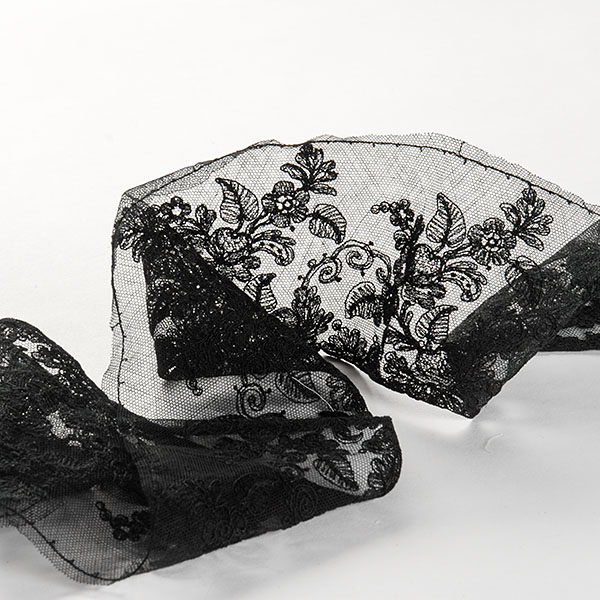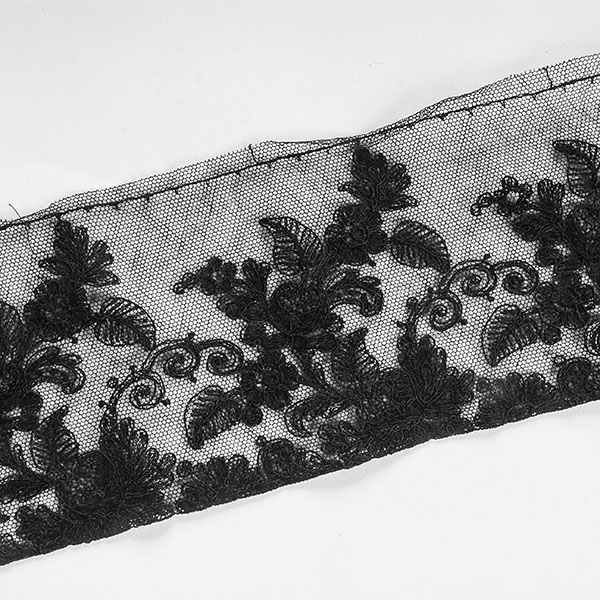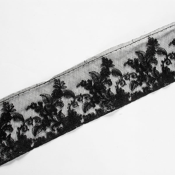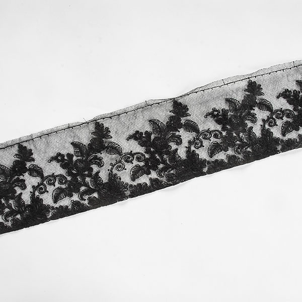 Krajka lem ornamentální vzor květů. - jemný bavlněný tyl s výšivkou květů v černé barvě barvě na tylu černé barvy. Krajka lem drobný květ je jemná, průsvitná s lehce plastickou výšivkou.