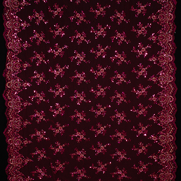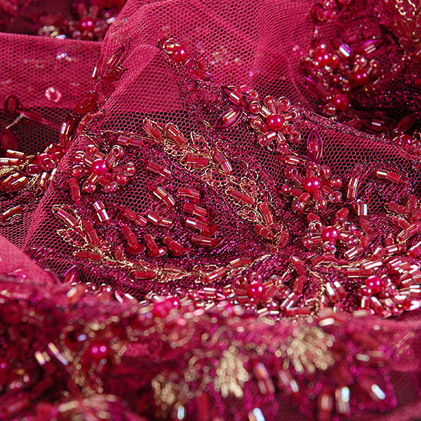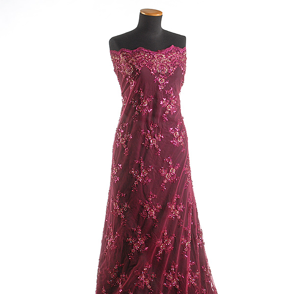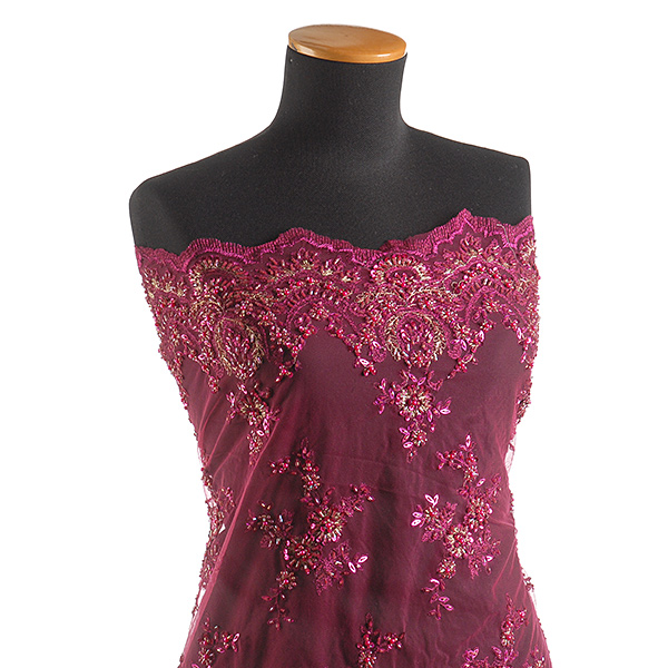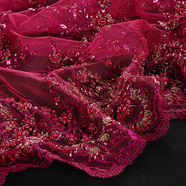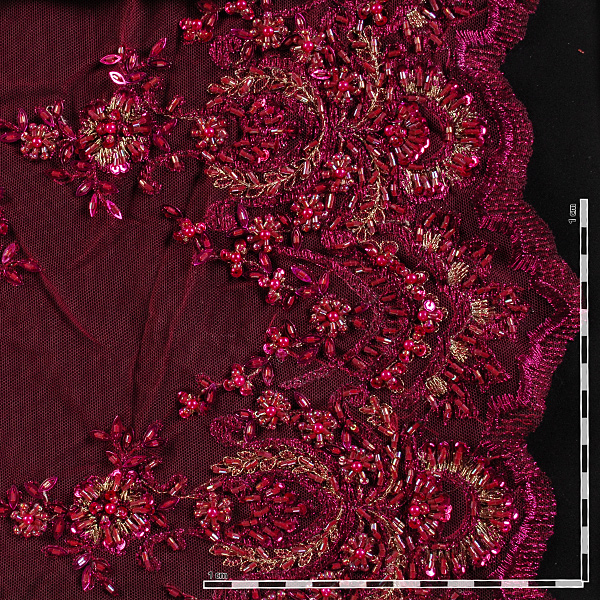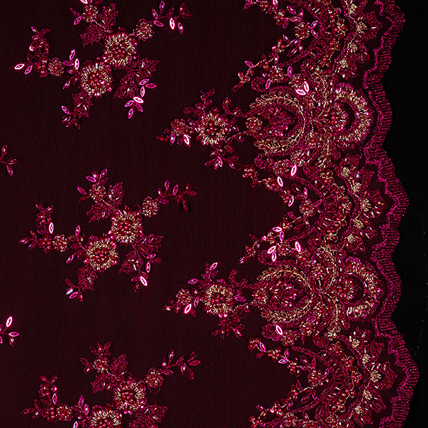 Krajka výšivka na tylu ve fuchsiové barvě s květinovým motivem s korálky na podkladovém tylu fuchsiové barvy s krajkovým vzorem. Krajková metráž je pružná svou vazbou, splývavá a průsvitná.