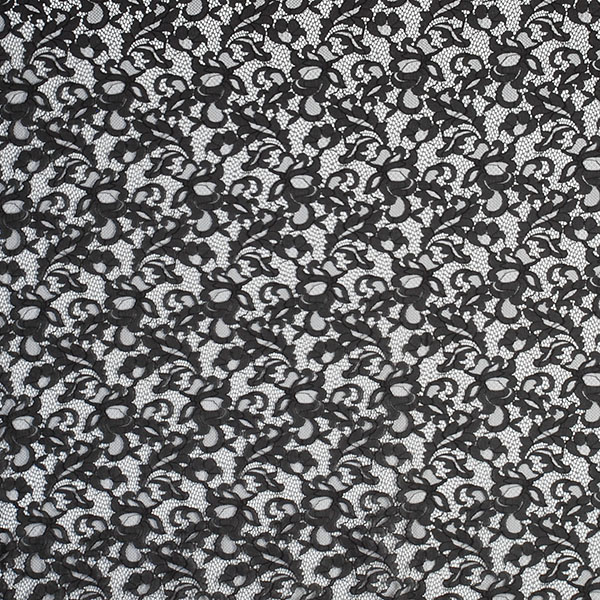 Krajka na tylu s velkými oky - lehce plastická krajka na tylu s velkými oky v černé barvě s květinovým vzorem. Krajka na tylu s velkými oky je průsvitná, má matný povrch, je splývavá a pružná svou vazbou.