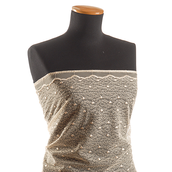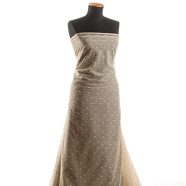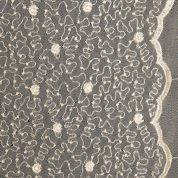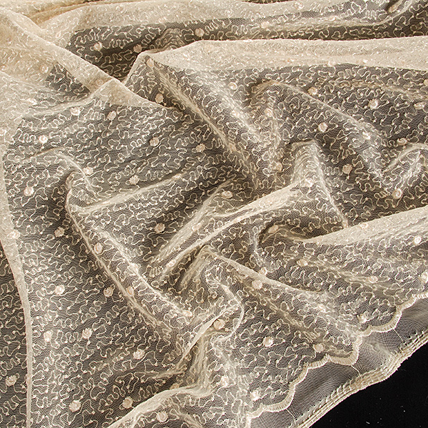 Krajka jemná výšivka na tylu - látka s romantickou geometrickou výšivkou vlnek a puntíků na tylu v barvě žlutosmetanové. Krajka je pružná svou vazbou, je průsvitná a splývavá.
