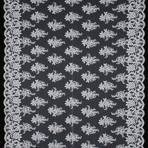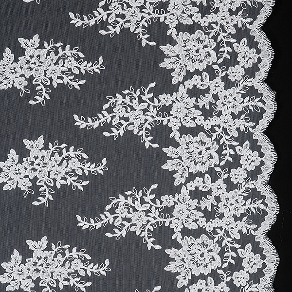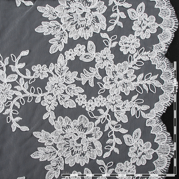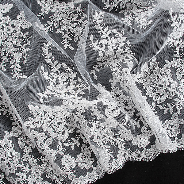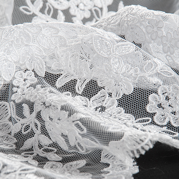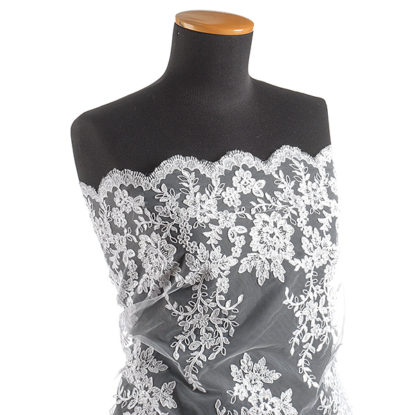 Krajka výšivka na tylu v barvě bílé s květinovým motivem. Podkladový vzorový tyl je v bílé barvě s krajkovým motivem. Krajková metráž je pružná svou vazbou, splývavá a průsvitná.