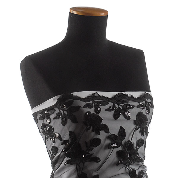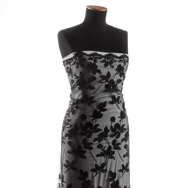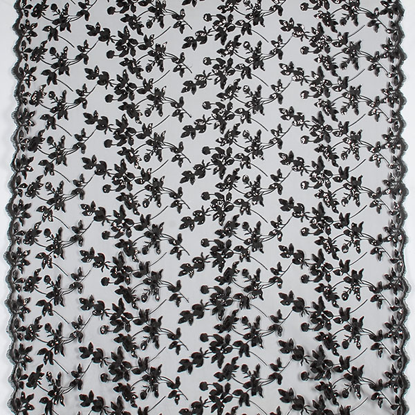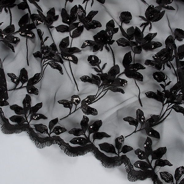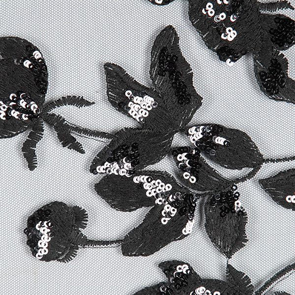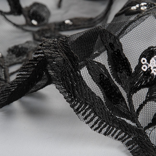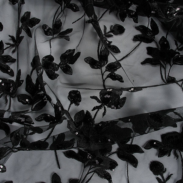 Krajka výšivka na tylu v černé barvě s květinovým motivem s flitry na podkladovém tylu černé barvy. Krajka výšivka na tylu je pružná svou vazbou, splývavá a průsvitná.
