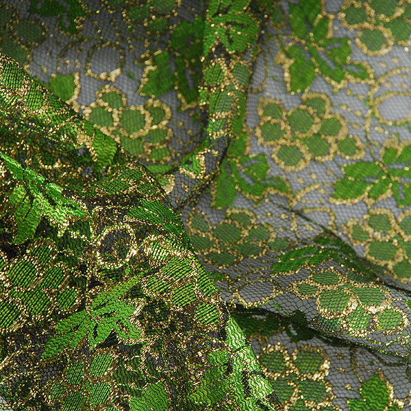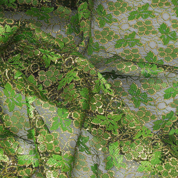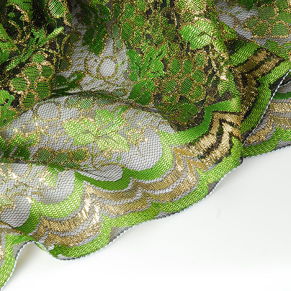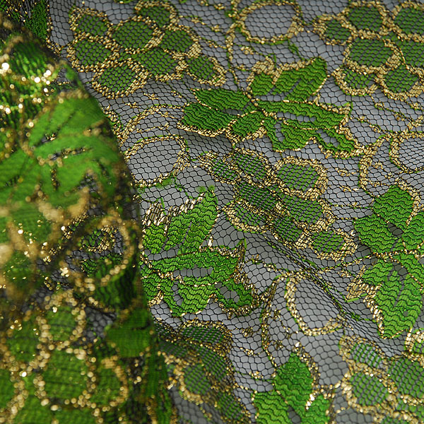 Netradiční krajková metráž se vzorem hroznů a listů vzájemně propletených a uložených v opakující se řadě. Krajka je úzké šířky, mírně pružná. Je výstřední svou barevnou kombinací - listová zelená, zlatý lem a černý tylový podklad.