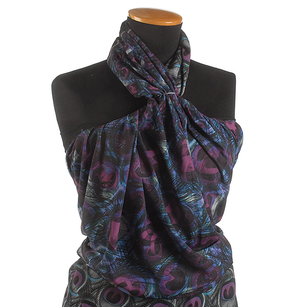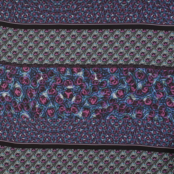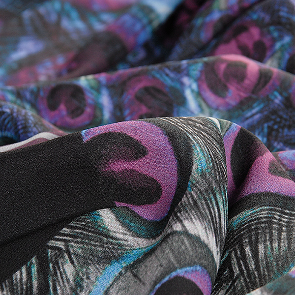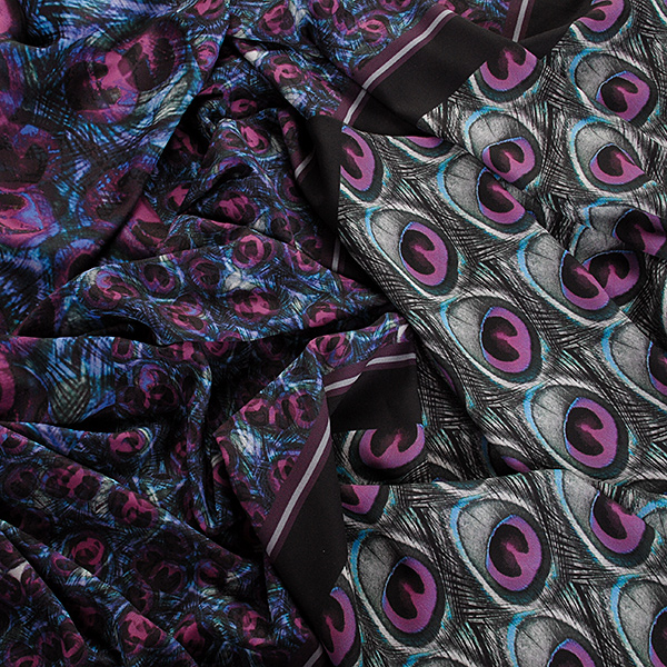 Krepdešín - jemný krepdešín s žebrovým povrchem ve světle modré barvě a tiskem pavých per. Krepdešín látka je splývavá a není průsvitná a je pružná svou vazbou. Krepdešínová metráž dobře drží švy a je velmi oblíbená na elegantní vzdušné halenky, tuniky, šaty či luxusní spodní prádlo.