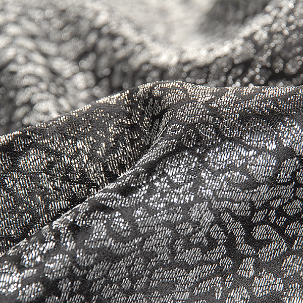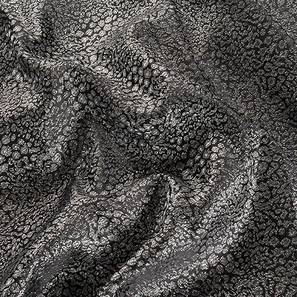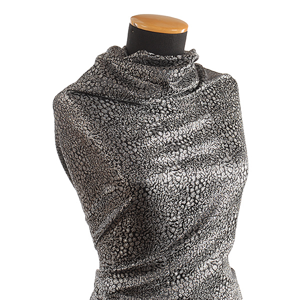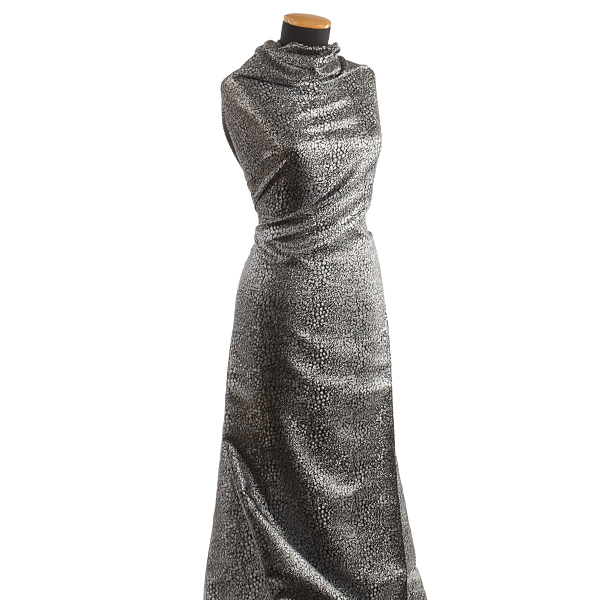 Lamé žakár brokát látka s kovově lesklým povrchem - efektní tkané lamé kovově lesklé barvách stříbrné a černé. Látka je jemná a lehce splývavá. Metráž patří k luxusním společenským látkám, které se hoví na včerní společenské šaty, lehká sáčka či košile.