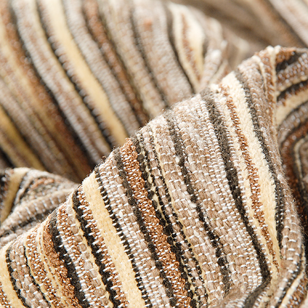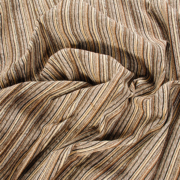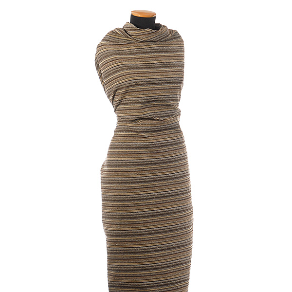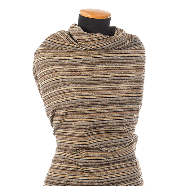 Vlněná kostýmová látka design MarLen - metráž imituje ručně tkané látky s plastickou strukturou proužků a je vyrobena z pletacích přízí MarLen v naší vlastní tkalcovně. Kostýmová metráž je v barvě hnědočerného melíru, je mírně splývavá a poddajná.