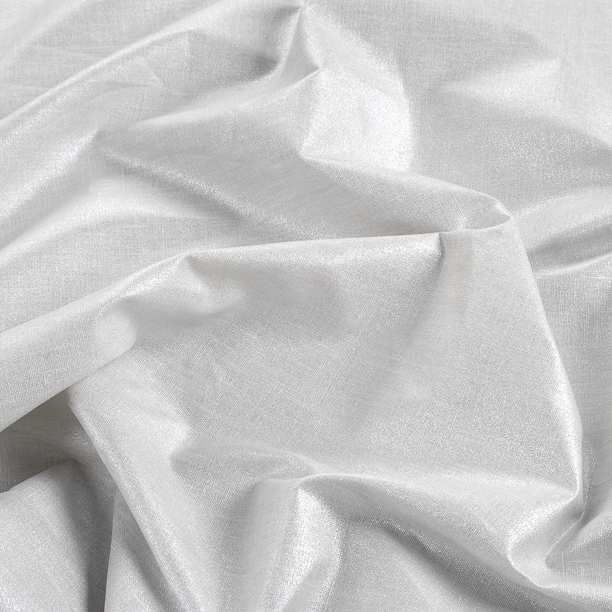 Len pevný se zátěrem polyakrylu lamé šedá stříbrná- lněná látka zpevněna polyakrilovým nánosem s třpytivým povrchem v stříbrné barvy na světle šedém podkladě. Lněná látka je pevnější vhodná na tašky, batohy či ubrus nebo i závěs.
