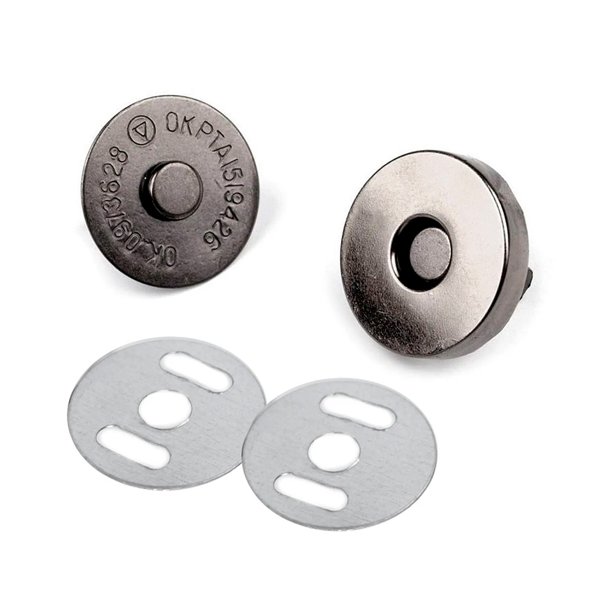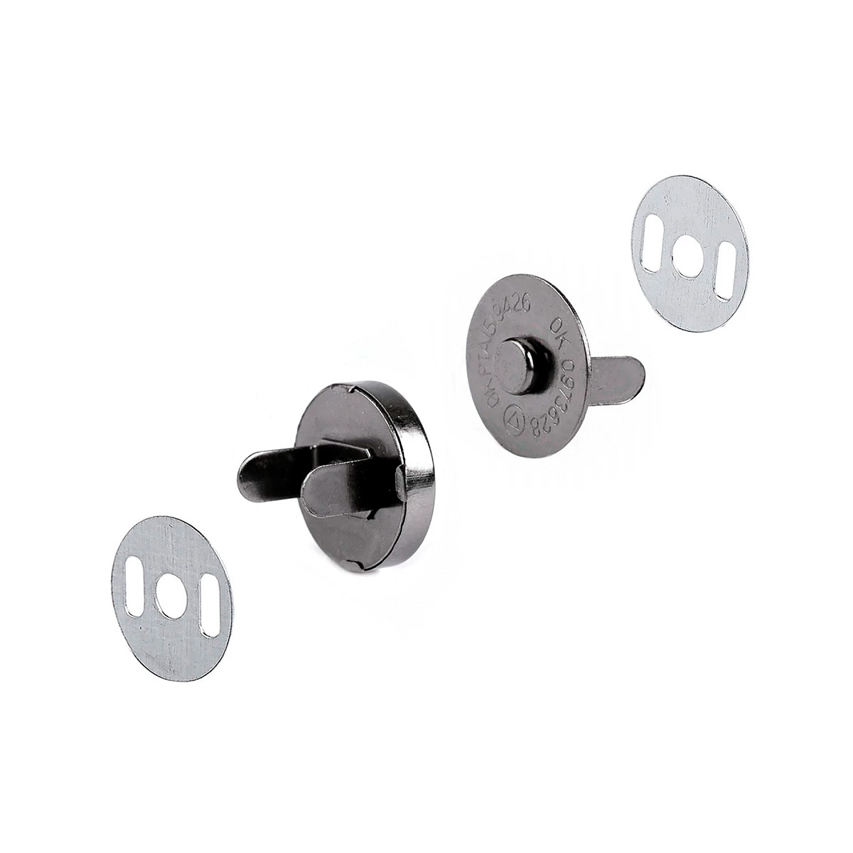 Magnetické zapínání 18 mm NIKL černá zapínání na způsob silného magnetu v barvě NIKL černá. Magnetické zapínání 18 mm NIKL černá zapínání je složeno ze dvou částí a podložek, které se vloží mezi látku a podšívku. Každý z dílů je potřeba připevnit na daný kus tašky či kabelky.