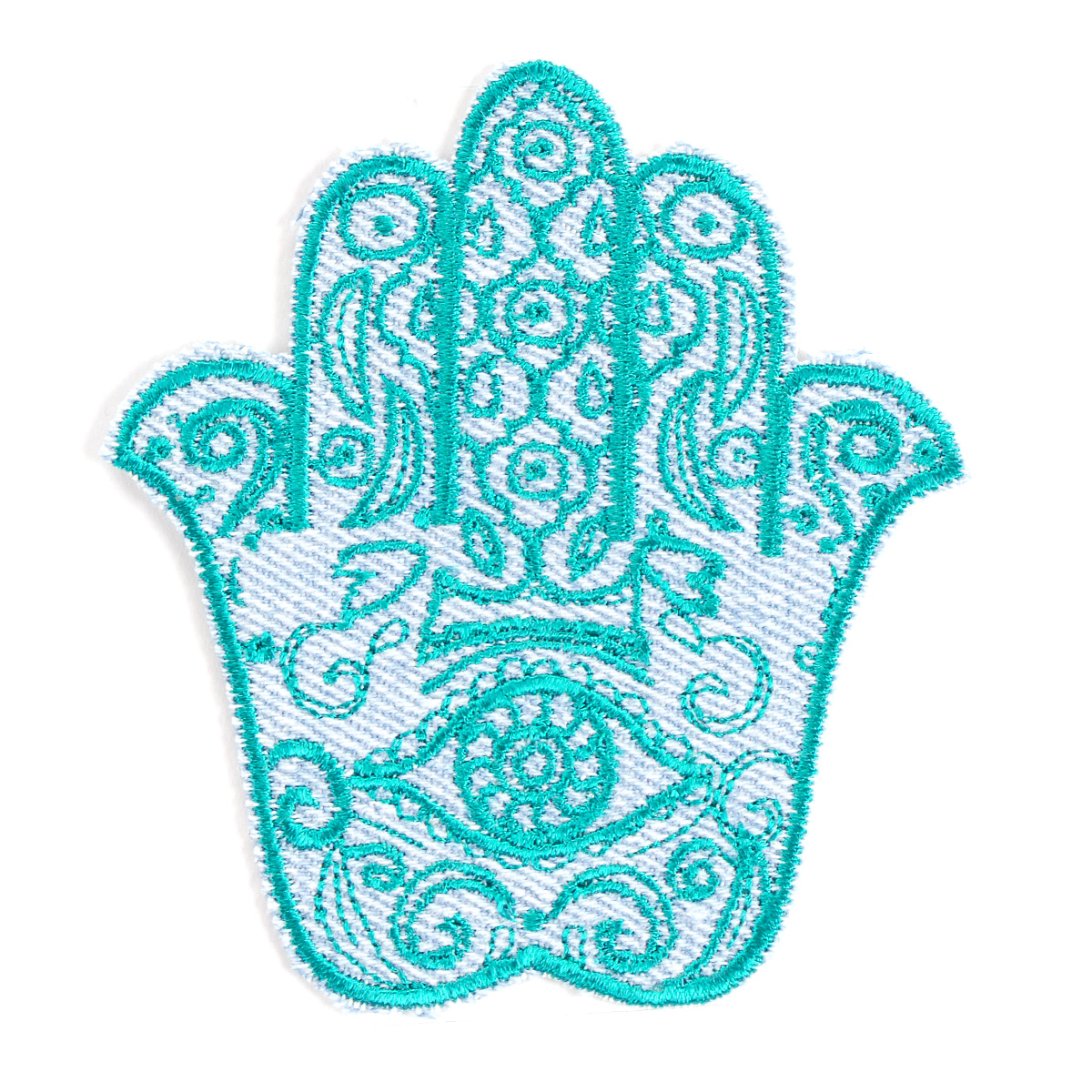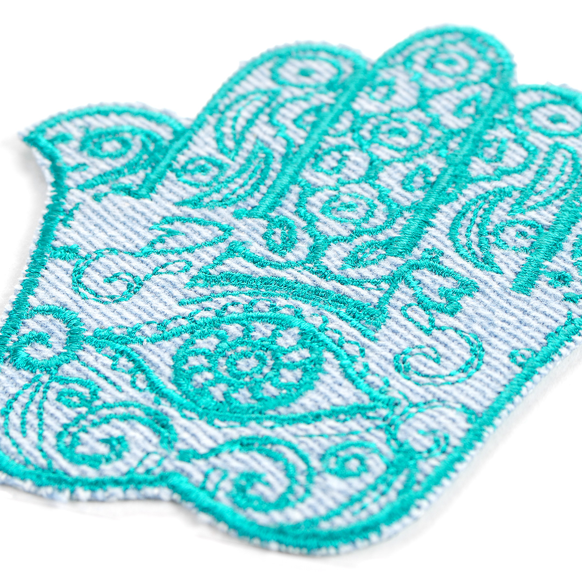 Nažehlovačka ruka s okem doplněna zdobným ornamenty v barvě tyrksové výšiky na bílém podkladě. Nažehlovačka je vhodná na dozdobení či opravě oděvu, ale i tašky, batůžku či psaníčka.