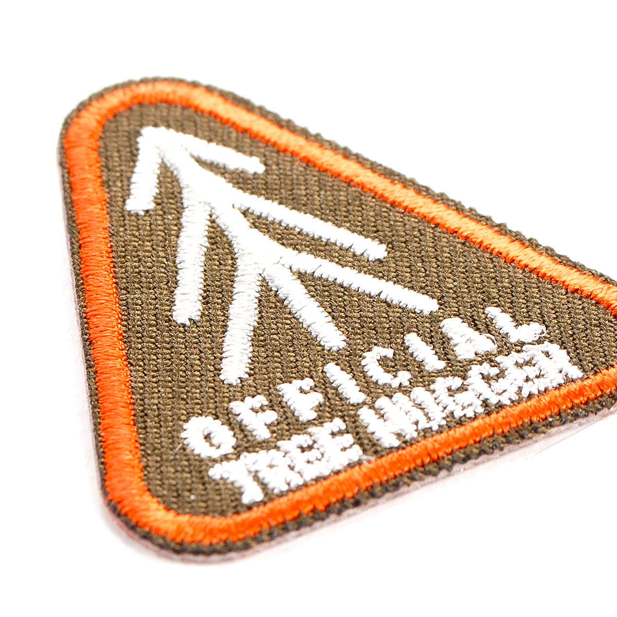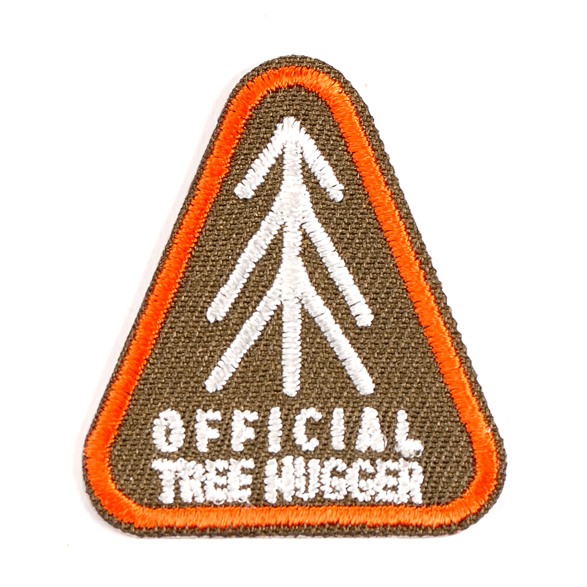Nažehlovačka/samolepící s nápisem Official Tree Hugger v khaki zelené barvě s bílou výšivkou a oranžovým lemem. Nažehlovačka je vhodná na dozdobení či opravě oděvu, ale i tašky, batůžku či psaníčka.