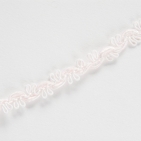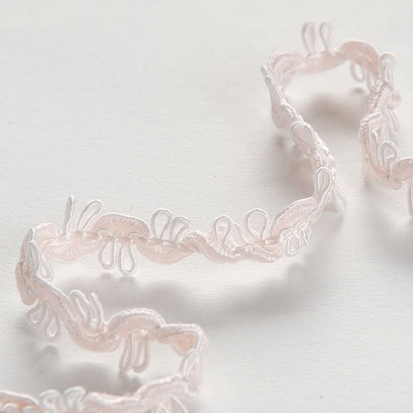 Oděvní prýmekdekorační prýmek smetanovorůžové barvy.Oděvní prýmek a oděvní porty jsou vhodné na dozdobení oděvu, například dobového kostýmu nebo dozdobení tašk či klobouku.