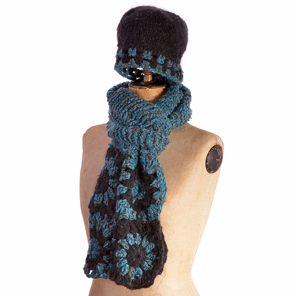 Originální design Marlen ručně pletená čepice a šála s háčkovaným lemem v barvách tyrkysovohnědého melíru a černé. Šála je ozdobena háčkovaným motivem kostek a čepice má háčkovaný kraj. Set je vyroben z pletací příze Marlen směs bavlny a akrylu a je jedinečný