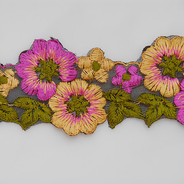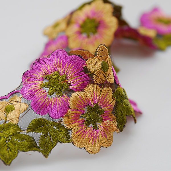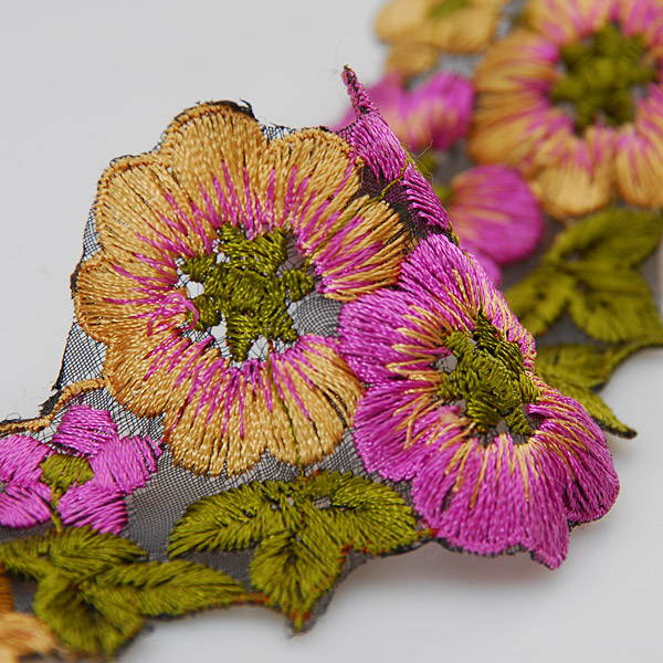 Textilní porta výšívaná organza. Výšivka je ve fialových a zlatobéžových barvách na černém podkladě. Barva lístečků je khaky zelená. Porta je průsvitná, měkká a lehce se z ní tvaruje. Nemá tvarovací drátek.