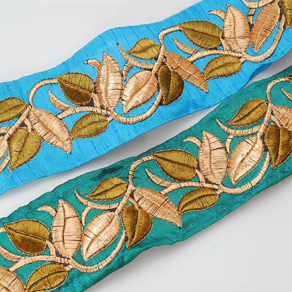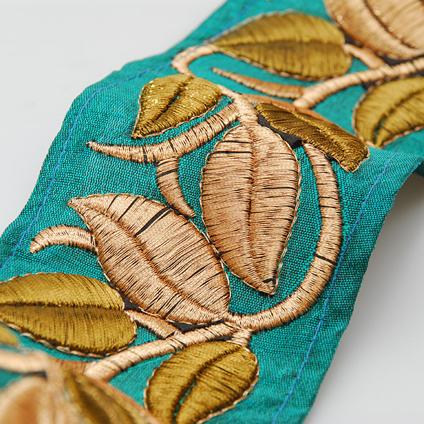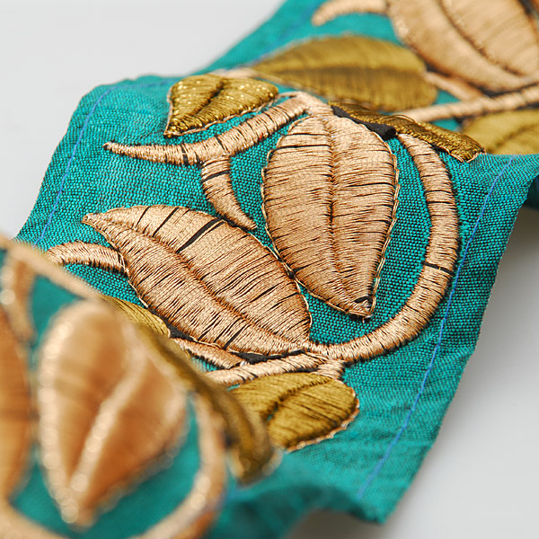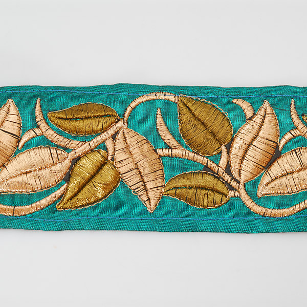 Textilní porta s lurexovou zlatou vyšivkou na hedvábném šantungu. Porta je vyšitá světlou a tmavou zlatou barvou na šanžánovém podkladě petrolejové barvy. Vyšívaná porta má motiv pnoucích se lístků a je vhodná na dozdobení oděvu. Ocenítě ji určitě při šití renesančního historického dobového kostýmu, nebo zdobení tašky, klobouku a podobně.
