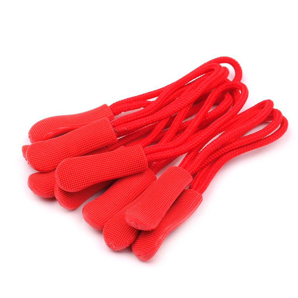 Plastové poutko taháček na jezdce zipu v červené barvě. Poutko je vyrobeno z pevného plastu a točené polyesterové šňůrky, která slouží k připevnění poutka na zip.