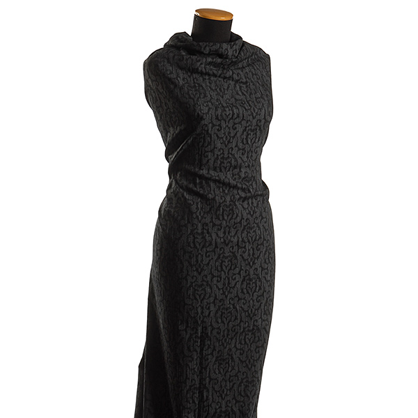 Pružná riflovina látka, metráž - pružná bavlna směs riflovina s plastickým romantickým vzorem ornametnů v barvě černé a šedé. Látka je lehce pružná a dost pevná i na sako/ kabátek. Vzor je mírně plastický s jemným vlasem podobným sametu.