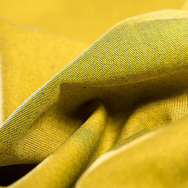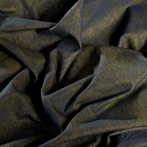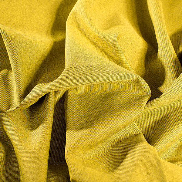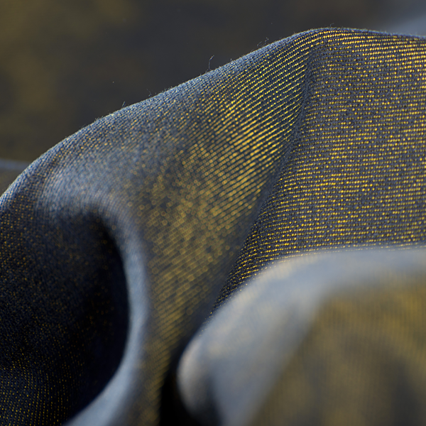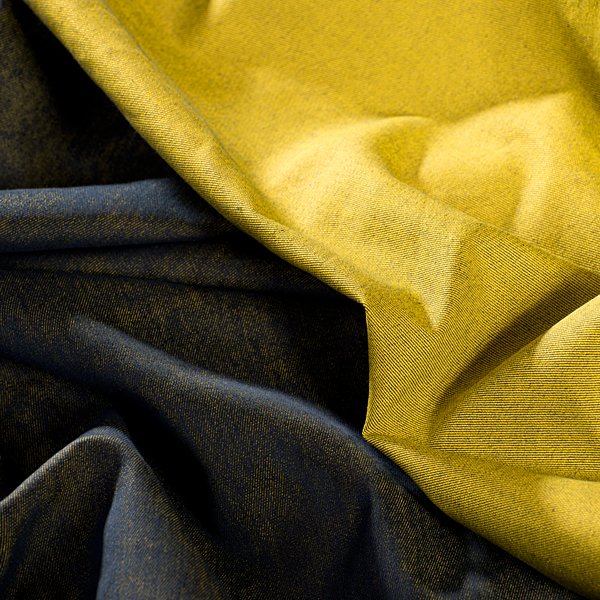 Látka, metráž - riflovina pružná v barvě žlutomodročerného melíru. Barva líce převážně žlutý melír, barva rubu převážně modročerný melír. Látka je jemnější, než klasická riflovina a lze ji použít oboustranně pro efektní kombinace.