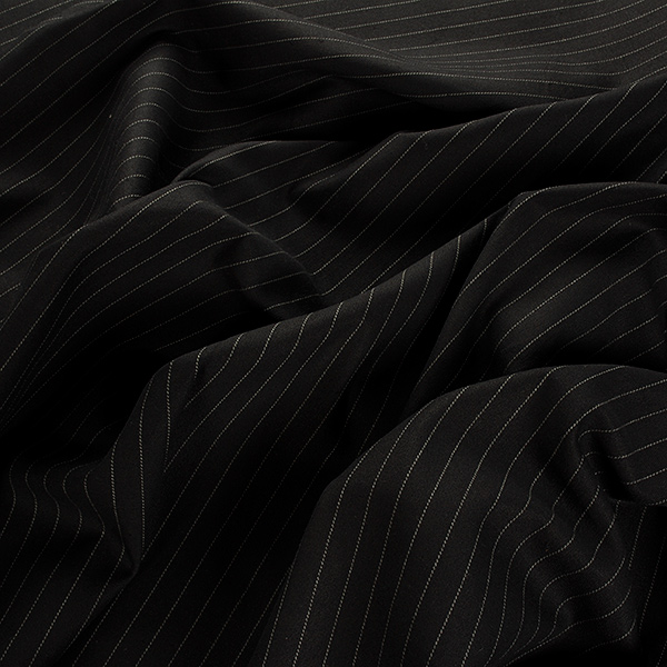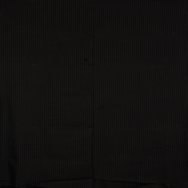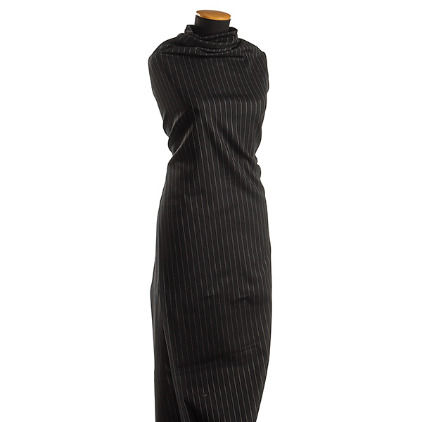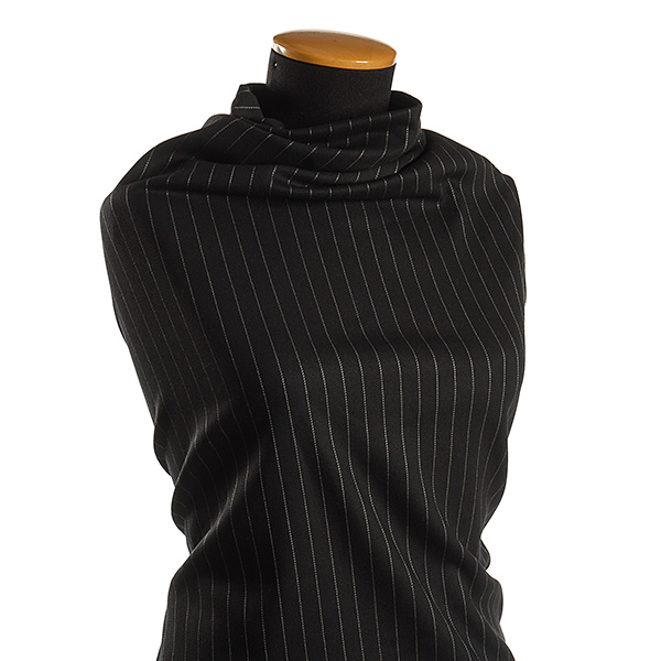 Látka, metráž - riflovina pružná v černé barvě s vetkaným šedobílým proužkem. Látka je pružná, dost pevná i na sako. Proužky jsou v pravidelné vzdálenosti cca 1,5cm a jsou po délce látky.