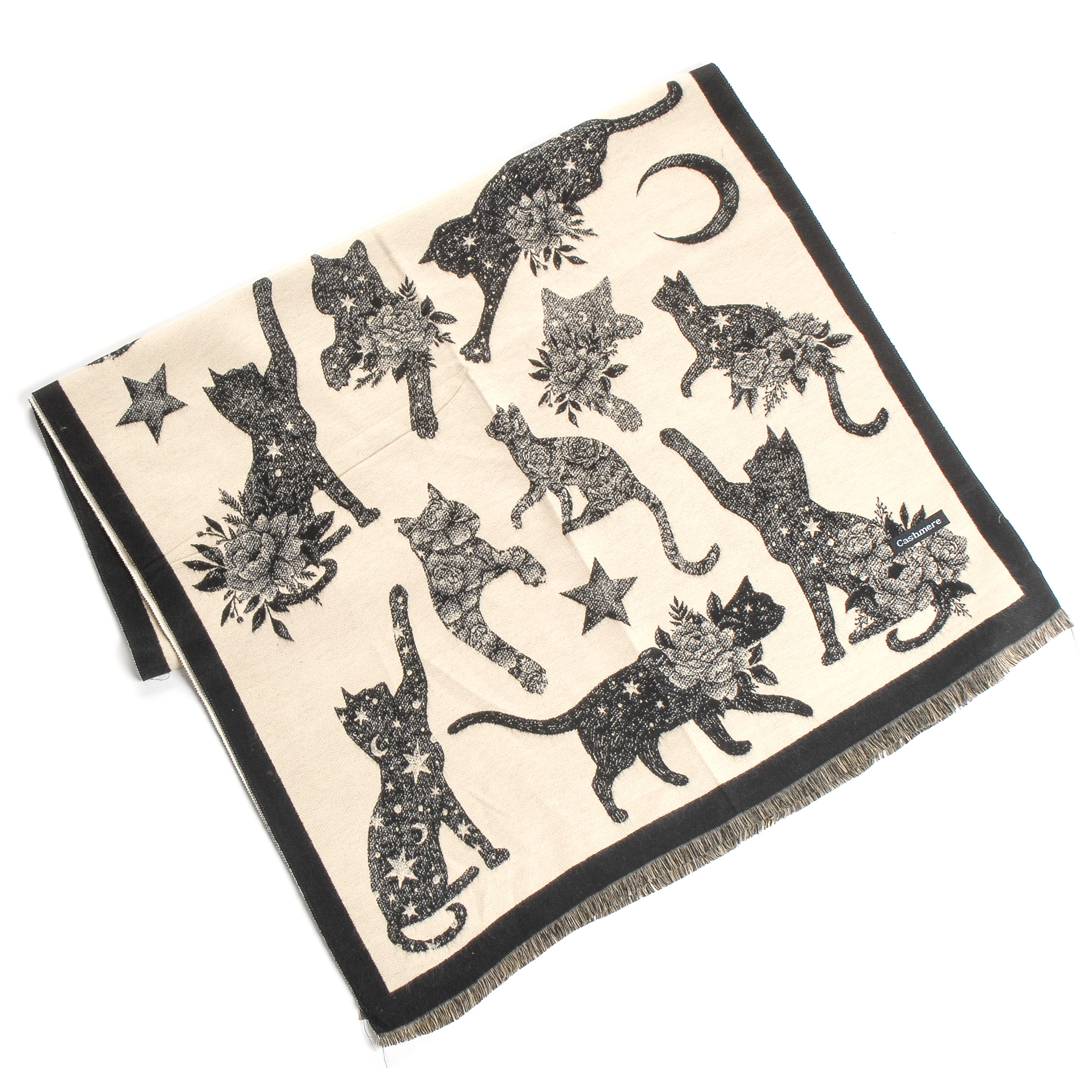 Šála oboustranná s kočkami krémová/černá- elegantní hřejivá šála se vzorem koček, koťátek a kočiček doplněna květinami, hvězdami a noční oblouhou v barvách krémové a černé. Šála oboustranná s kočkami krémová/černá má jen malé cca 15mm dlouhé třásně, je měkka, hebká a velmi příjemná na omak, a určitě se bude příjemně nosit.