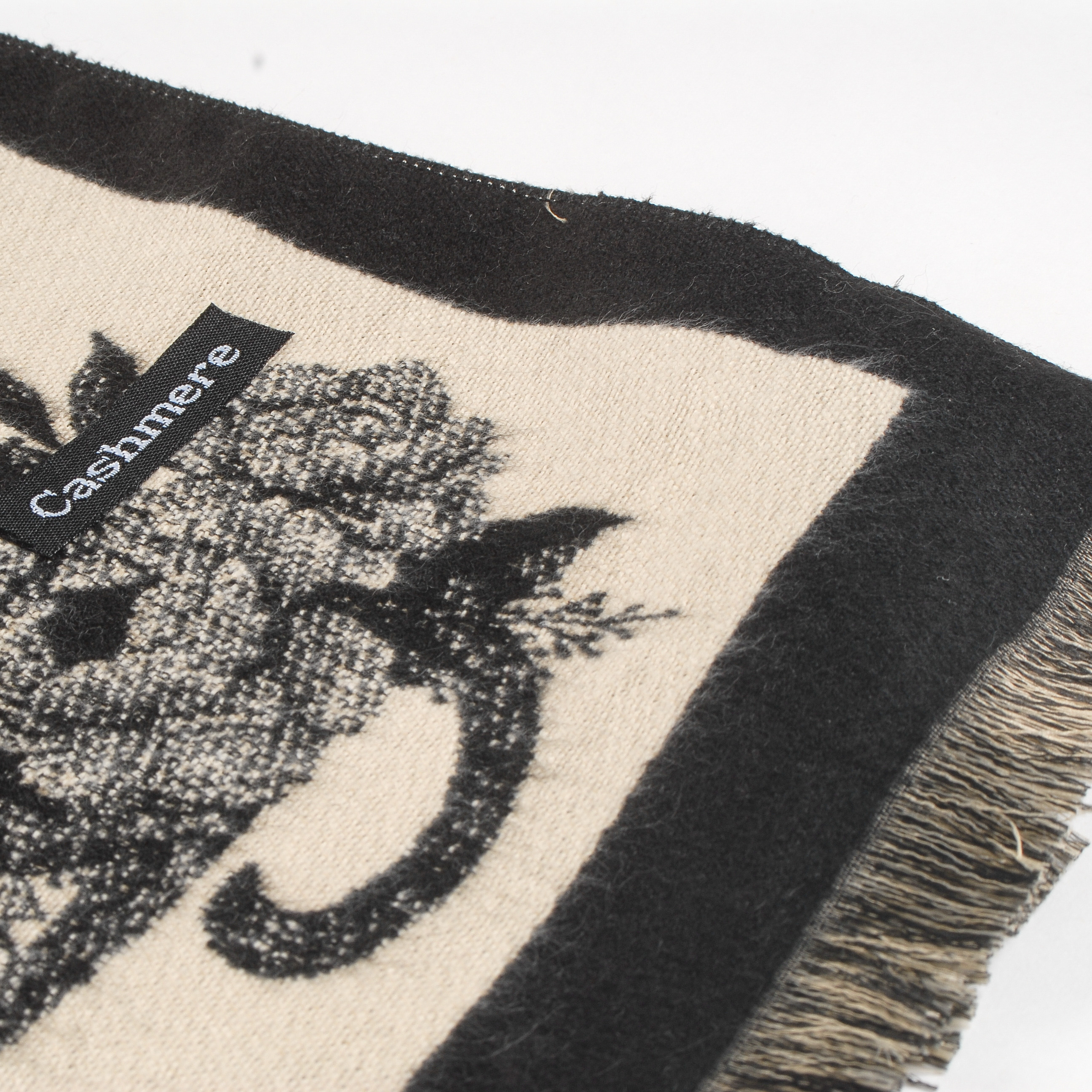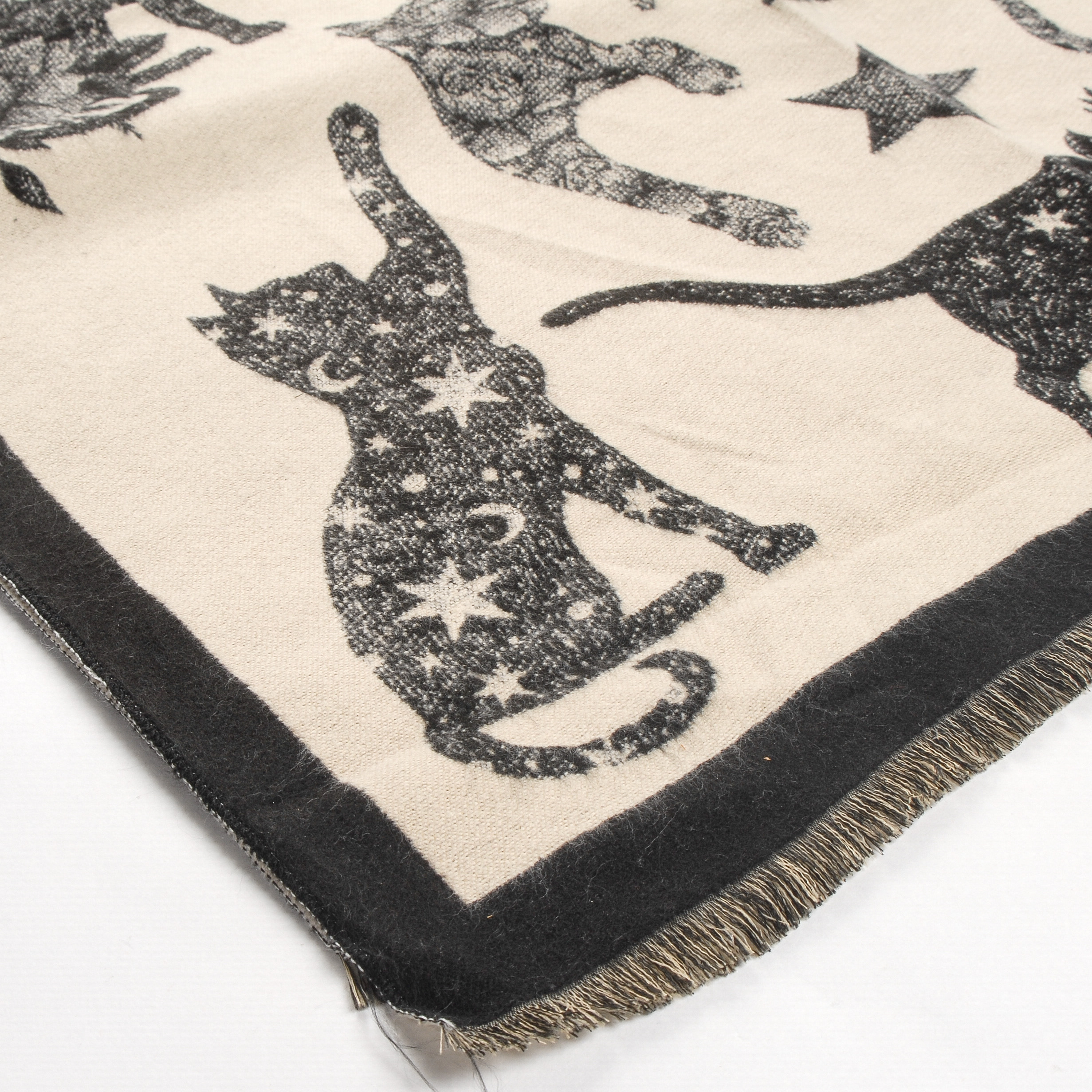 Vzor: šála je oboustranná z jedné strany je krémová půda a černě vykreslen vzor, a z druhé strany je půda černá a krémově vykreslen vzor. Velikost koček je cca 20 x 9 cm až 30 x 15 cm. Velikost hvězdy je cca 6 x 6 cm.